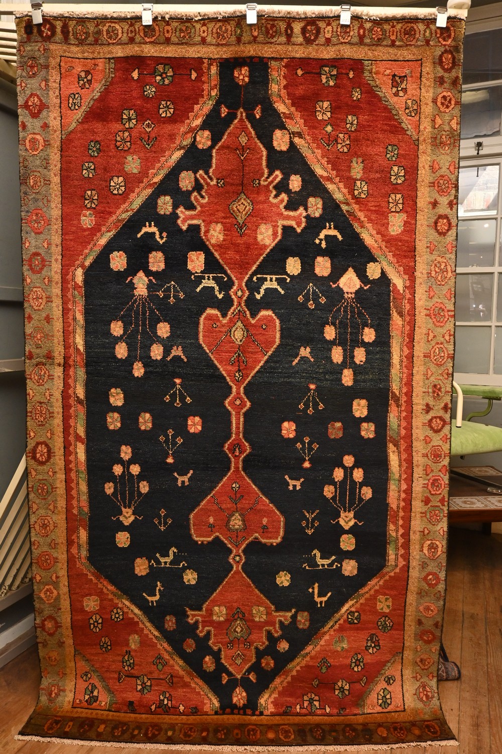 A TRIBAL PERSIAN KOLYAIE RUG. 100% WOOL. HAND-KNOTTED VILLAGE WEAVE FROM THE KURDISTAN REGION WITH TRIBAL DESIGN OF A MIRRORED MEDALLION IN RED ON A NAVY BLUE FIELD WITH TREE OF LIFE, ROSETTES, AND ANIMAL MOTIFS. BORDER OF TRIBAL FLORAL MOTIFS. SIZE: 264 X 152 CM ORIGIN: PERSIA - RRP: $2,700 DOCUMENTATION OF AUTHENTICITY INCLUDED.