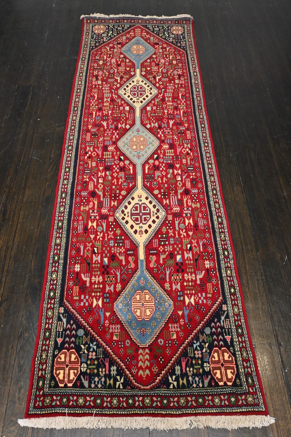 A PERSIAN ABADEH HEYBATLOU RUNNER, EXTREMELY FINE WOOLLEN WEAVE WITH THE MOST INTRICATE AND COMPLEX MOTIFS, CONSISTING OF PEACOCKS, LAMAS, BUTTERFLIES, FLORAL MOTIFS. DIAMOND LINKED MEDALLIONS CONTAINING AMULETS ON A RICH DECORATIVE RED FIELD OUTLINED WITH INDIGO BLUE CORNER MEDALLIONS. IN EXCELLENT CONDITION. SIZE: 300 X 90 CM ORIGIN: PERSIA - RRP: $2,800 DOCUMENTATION OF AUTHENTICITY INCLUDED.