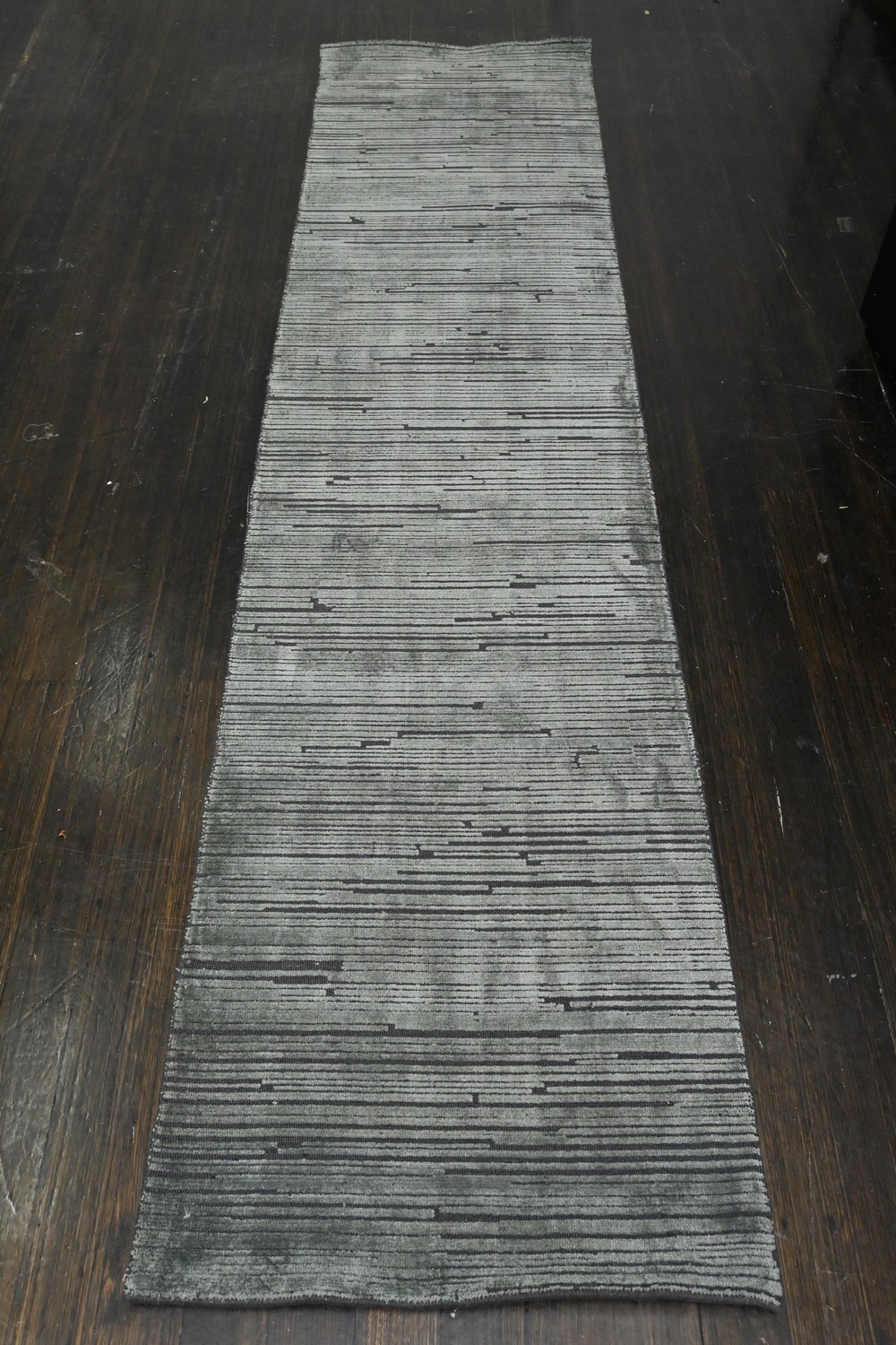 A NEW MODERN TEXTURED HAND-WOVEN RUNNER. WOOL AND SILKY TEXTURE (VISCOSE). IN CHARCOAL AND GREY TONES. SIZE: 350 X 80 CM ORIGIN: INDIA