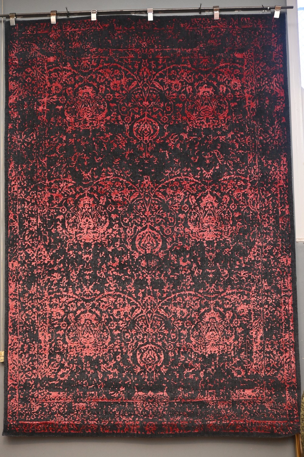 BRAND NEW MODERN TRANSITIONAL DESIGNER RUG. WOOL PILE WITH EMBOSSED SILKY PATTERN. IN CHARCOAL AND RED HUES. ORIGIN: INDIA - RRP: $3,300 -SIZE: 187 X 270 CM DOCUMENTATION OF AUTHENTICITY INCLUDED.
