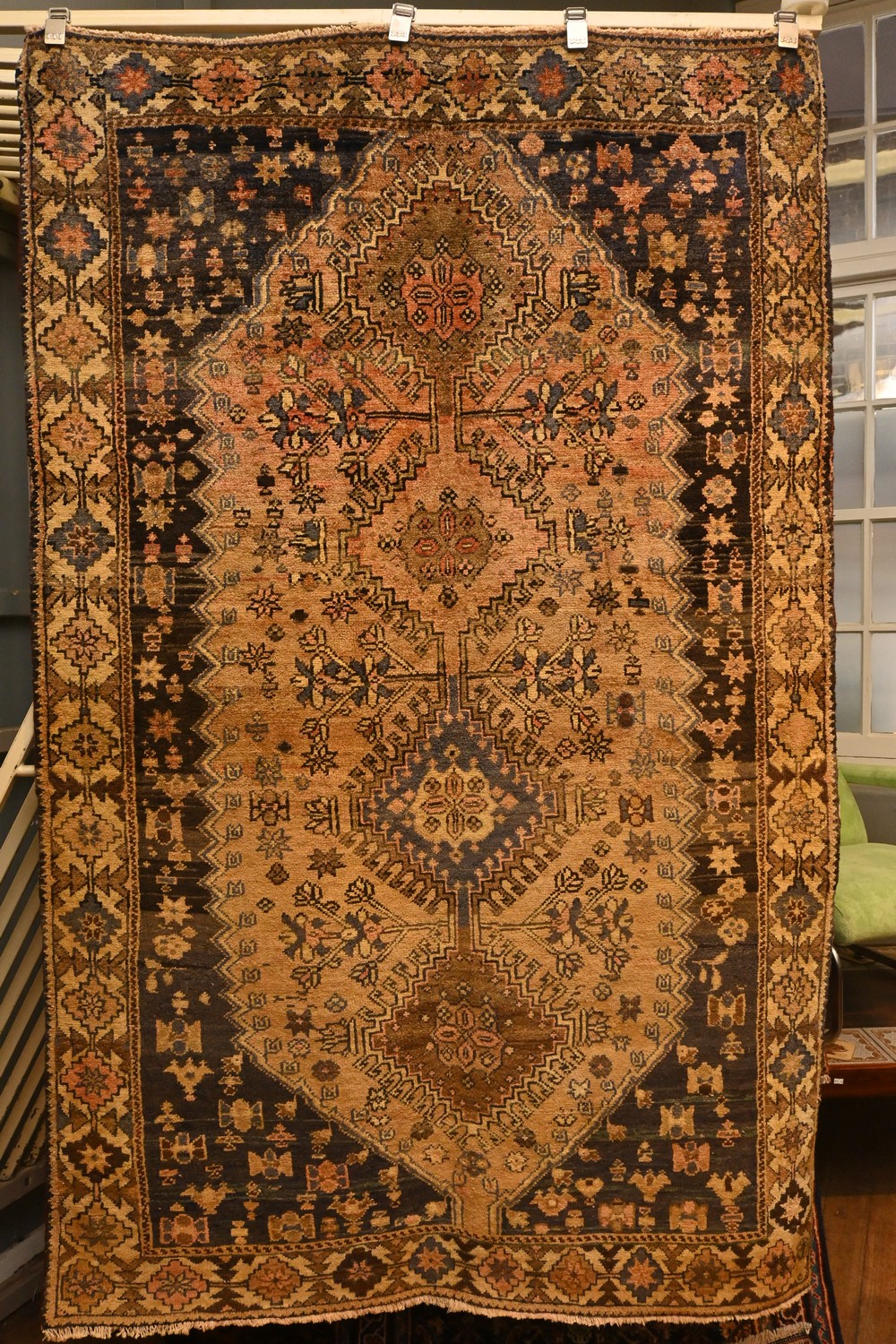 A CIRCA 1970'S TRIBAL PERSIAN QASHQAIE RUG. 100% HAND SPUN WOOL, NATURAL DYES, NATURAL ABRASH. HAND-KNOTTED TRIBAL QASHQAIE WEAVE FROM THE FARS PROVINCE WITH TRIBAL DESIGN OF DIAMOND-SHAPED LATCH-HOOKED POLE MEDALLIONS CONTAINING AMULETS SET WITHIN A SOFT FIELD OF TRIBAL MOTIFS. SURROUNDING FIELD OF MOTIFS SET ON A CHARCOAL HUE. RESTORED TO GALLERY CONDITION. SIZE: 215 X 136 CM ORIGIN: IRAN - RRP: $2,800 DOCUMENTATION OF AUTHENTICITY INCLUDED.