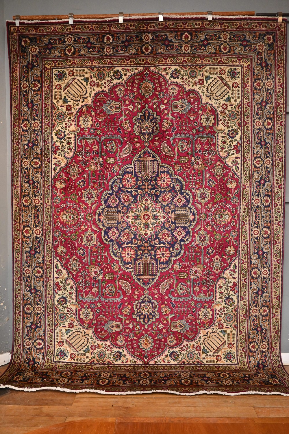 A HAND-KNOTTED PERSIAN CIRCA 1970'S TABRIZ AZARSHAHR CARPET. 100% WOOL, CERTAIN AREAS HAVE VINTAGE PILE. CLASSIC TABRIZ DESIGN OF BOLD ELONGATED -CHANDELIER FLORAL MEDALLION IN PERSIAN BLUE & QUARTERED CORNER MEDALLIONS CONTAINING CYPRESS TREES ON A RUBY RED FIELD. WITH ALL OVER FLORAL SPRAYS, PAISLEY MOTIFS, WILLOW TREES & TENDRILS. MAJOR BORDER OF FLORAL SPRAYS, & PALMETTES ON A DEEP BLUE FIELD. RESTORED TO GALLERY CONDITION. ORIGIN: PERSIA - RRP: $4,900 SIZE: 360 X 254 CM DOCUMENTATION OF AUTHENTICITY INCLUDED.