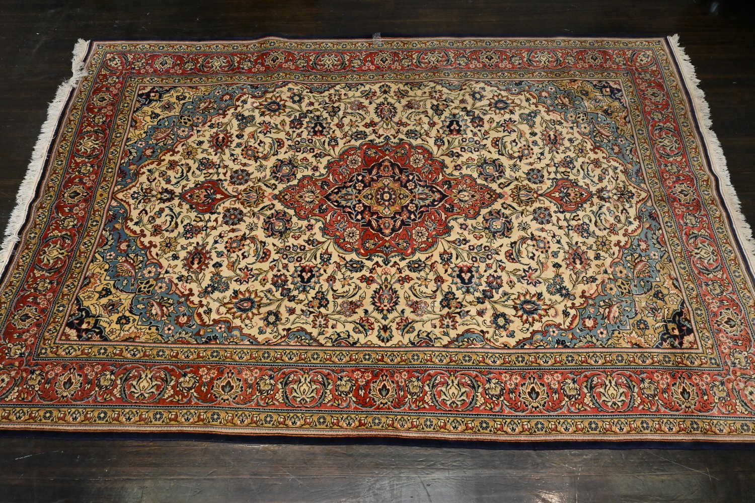 A HANDMADE SAROQ RUG WITH CENTRAL MEDALLION DESIGN IN CREAM AND RED TONES (A/F) (335 X 218 CM) (PLEASE NOTE THIS HEAVY ITEM MUST BE REMOVED BY CARRIERS AT THE CUSTOMER'S EXPENSE. LEONARD JOEL STAFF CANNOT ASSIST CARRYING THIS ITEM) (X-LARGE ITEM)