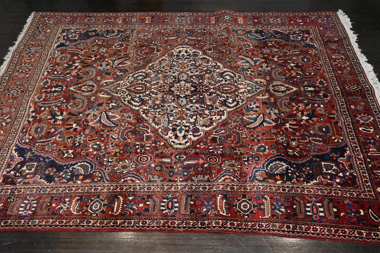A HANDMADE BAKTIARI RUG IN RED TONES WITH A CENTRAL MEDALLION DESIGN (A/F) (392 X 261 CM) (PLEASE NOTE THIS HEAVY ITEM MUST BE REMOVED BY CARRIERS AT THE CUSTOMER'S EXPENSE. LEONARD JOEL STAFF CANNOT ASSIST CARRYING THIS ITEM) (X-LARGE ITEM)