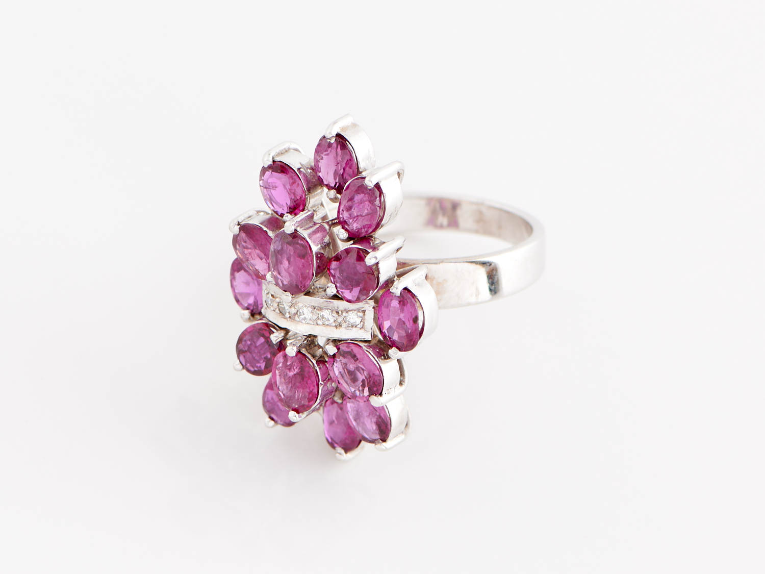 A RUBY AND DIAMOND CLUSTER RING IN LOW CARAT WHITE GOLD, SIZE O