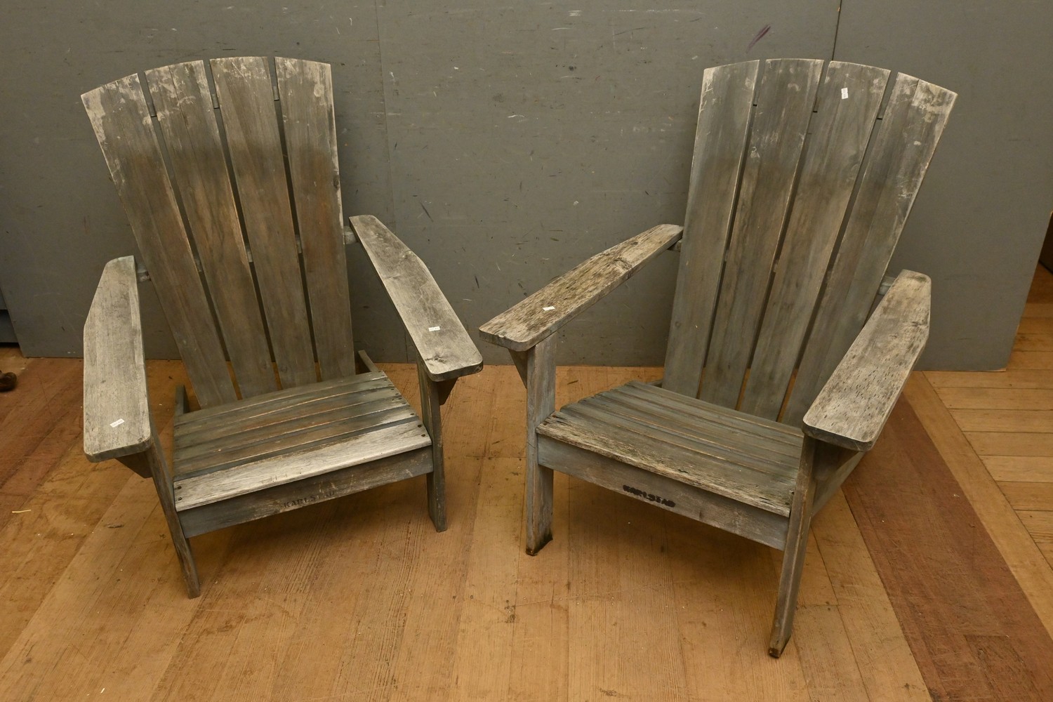 A PAIR OF ADIRONDAK TIMBER CHAIRS (A/F) (H91 X W72 X D78 CM) (LEONARD JOEL DELIVERY SIZE: X-LARGE)
