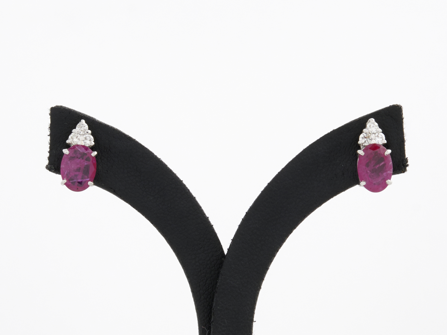 A PAIR OF RUBY AND DIAMOND SET STUDS IN 18CT WHITE GOLD, THE RUBIES TOTALLING APPROXIMATELY 2.60CTS, THE DIAMONDS TOTALLING APPROXIMATELY 0.20CTS, TO POST AND BUTTERFLY FITTINGS, ACCOMPANIED BY VALUATION, SIZE 6.1 X 12.6MM, WEIGHT 2.6GMS
