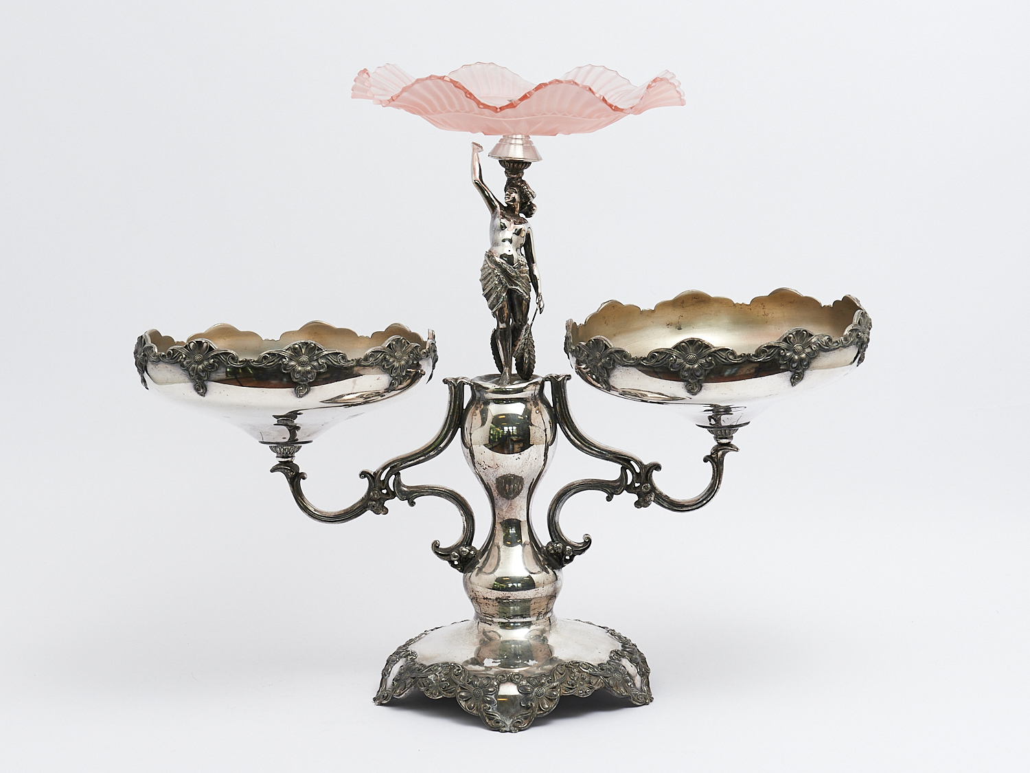A SILVER PLATED FIGURAL CENTREPIECE WITH FROSTED PINK GLASS BOWL, H.47CM, LEONARD JOEL LOCAL DELIVERY: MEDIUM