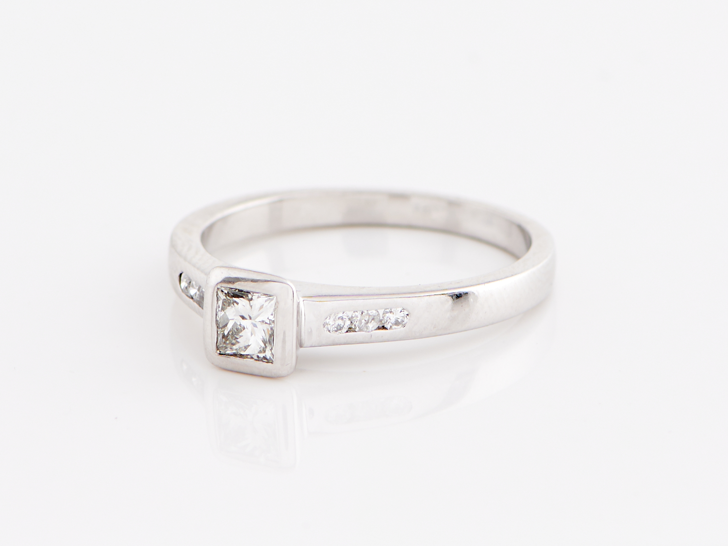 A PRINCESS CUT DIAMOND SET RING IN 18CT WHITE GOLD, RING SIZE O, WEIGHT 3.9GMS