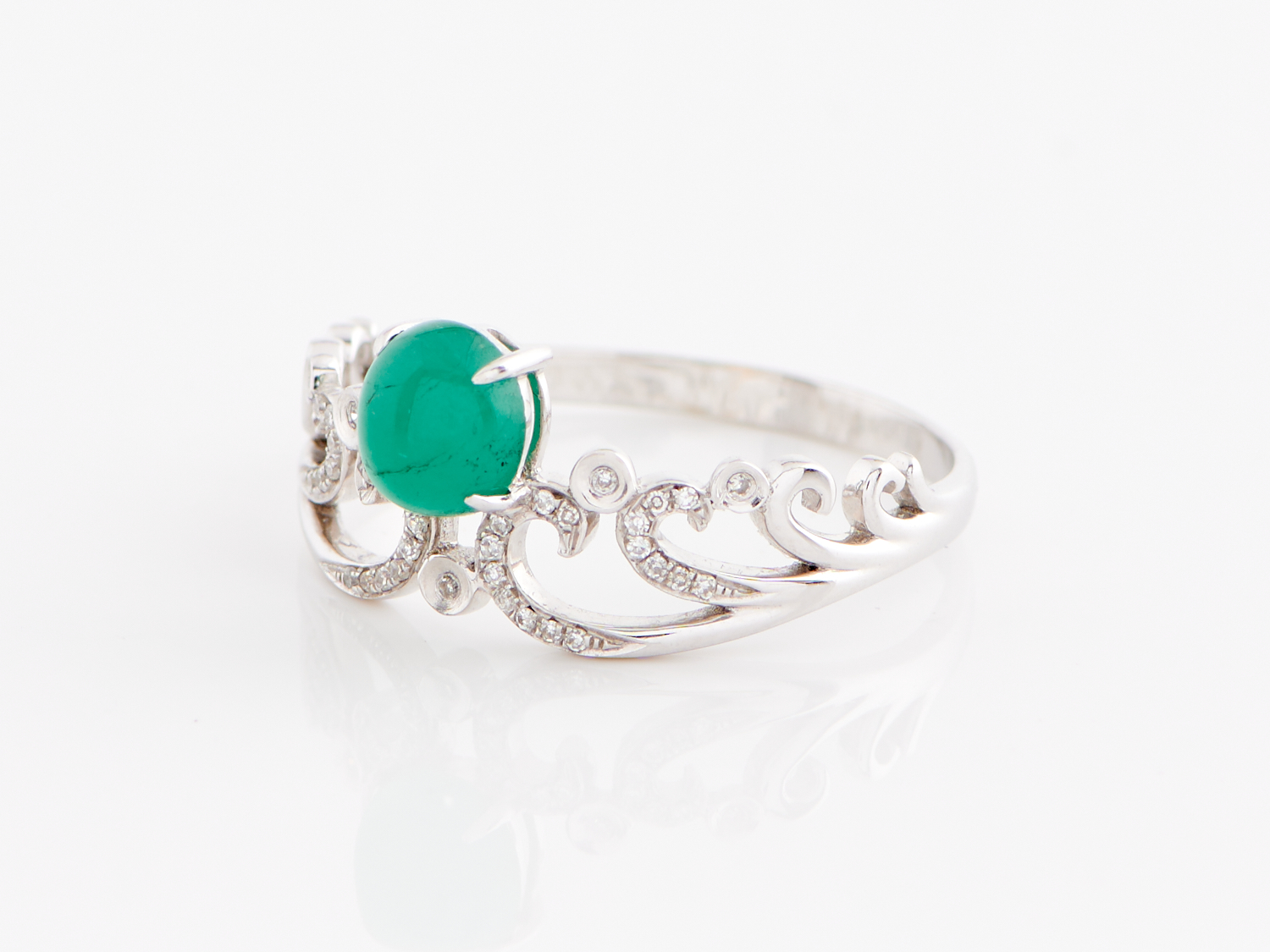A CABOCHON EMERALD AND DIAMOND SET RING IN 18CT WHITE GOLD, RING SIZE Q-R, WEIGHT 2.6GMS