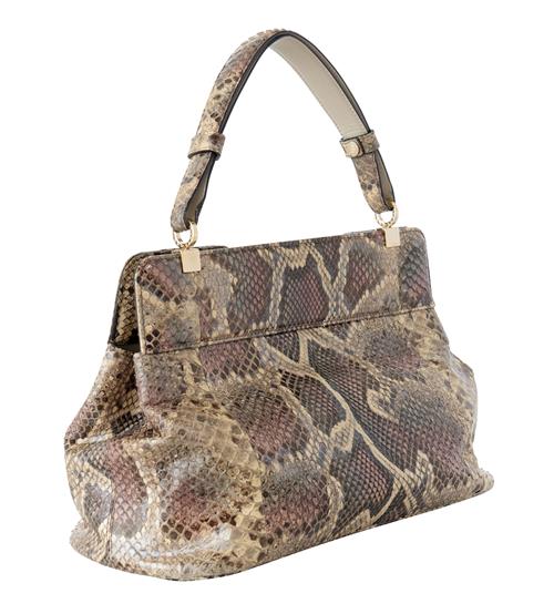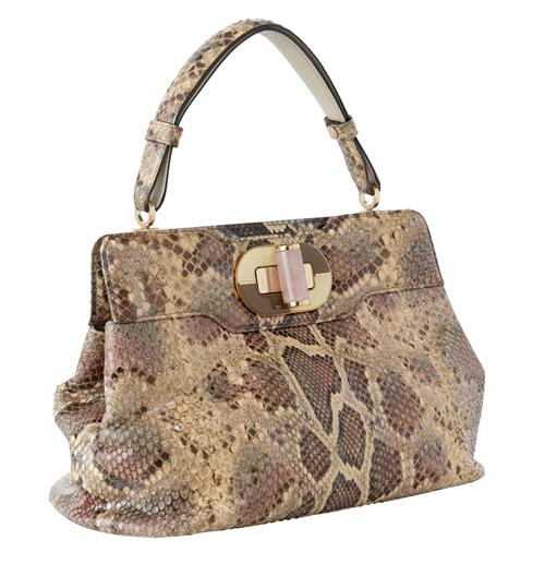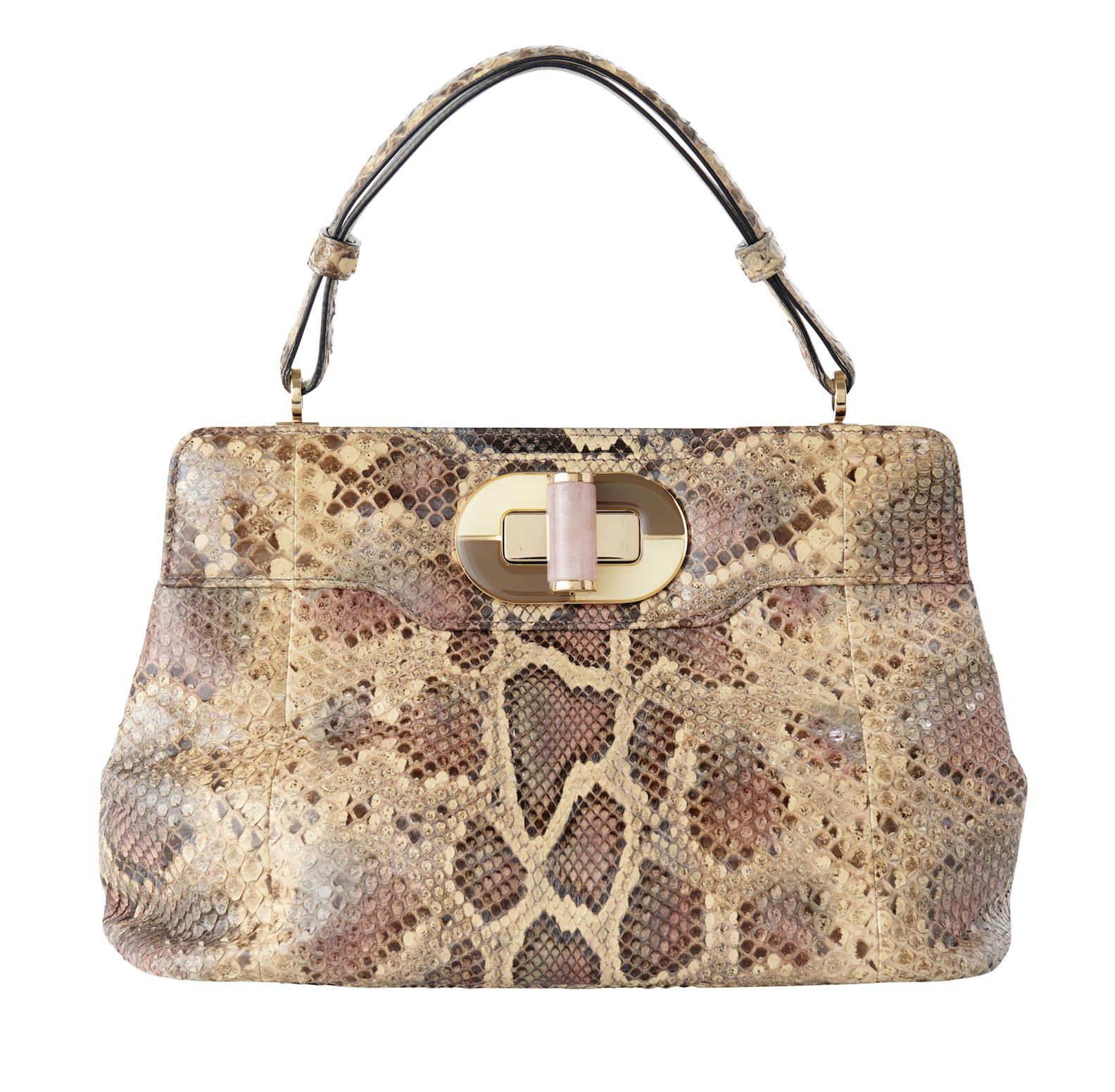 Styled in snake skin with gold tone metal hardware and rose quartz turn-lock clasp, 30 x 20 x 15cm.