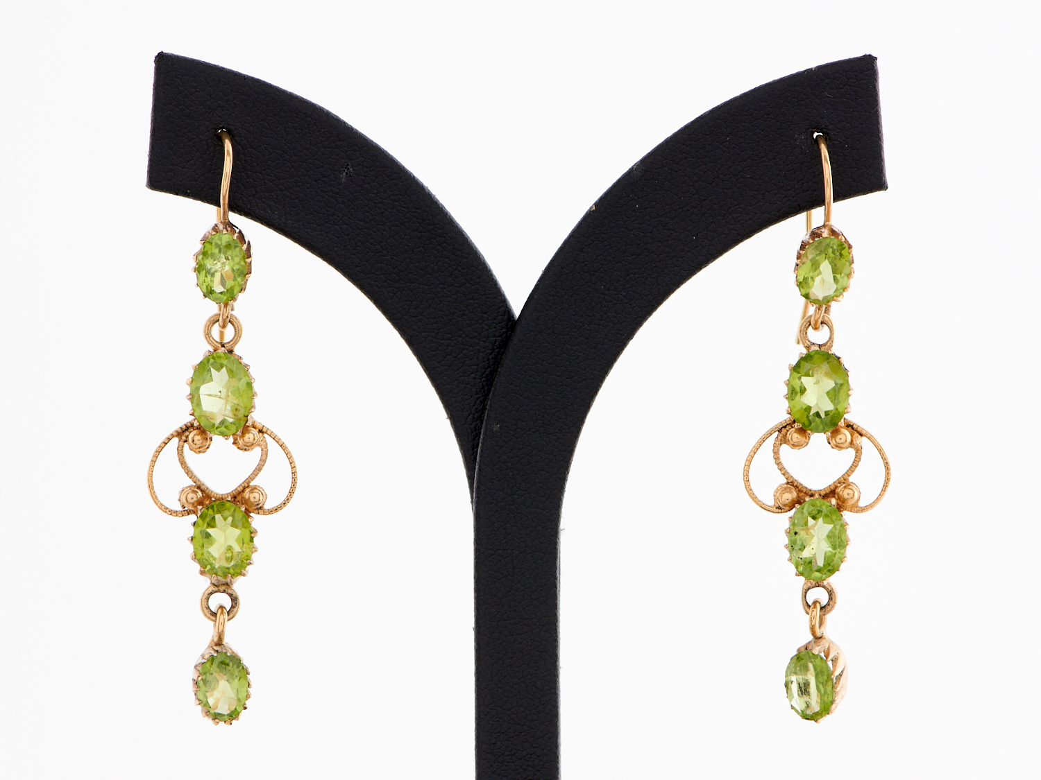 A PAIR OF PERIDOT SET DROP EARRINGS TO SHEPHERD HOOK FITTINGS IN GOLD PLATE, SIZE 15 X 57MM