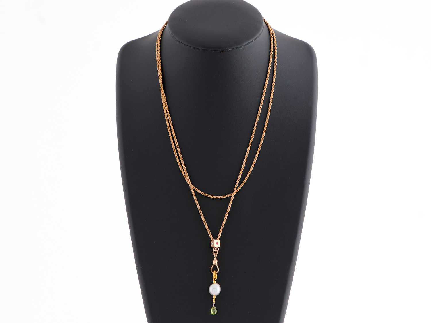 A GOLD PLATED ROPE STYLE GUARD CHAIN TO A GOLD PLATED PEARL AND PERIDOT CHARM, LENGTH 1320MM