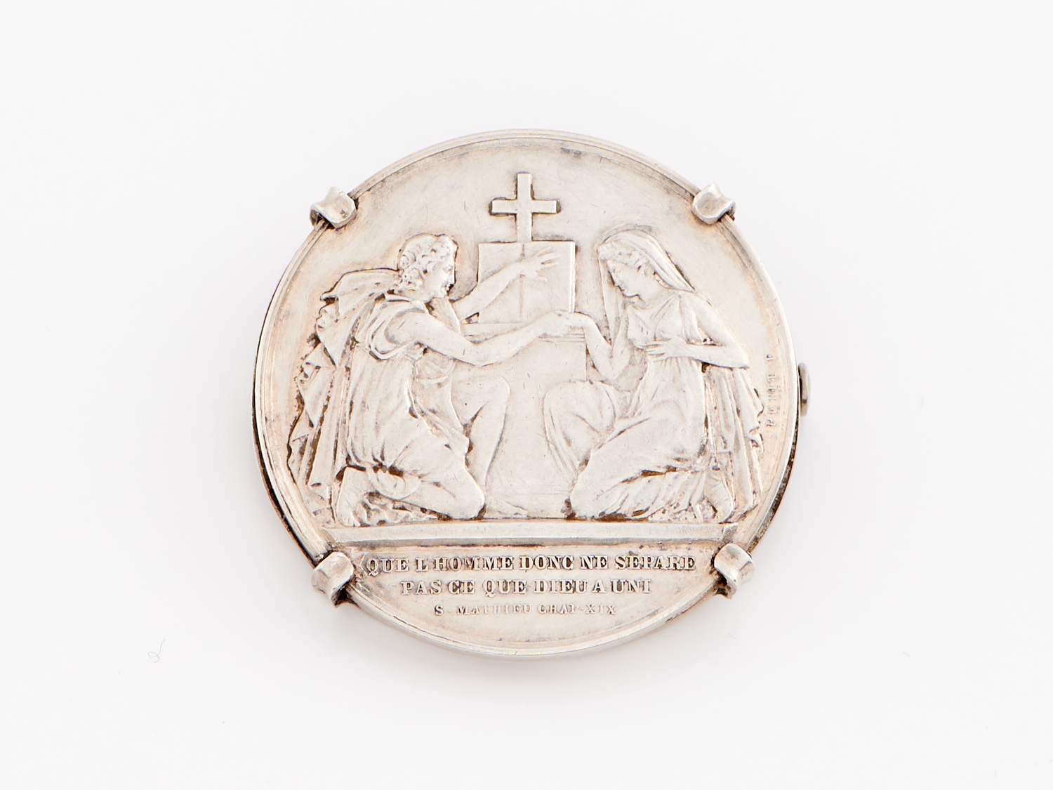 A FRENCH SILVER MARRIAGE MEDALLION BROOCH IN A SILVER FRAME, DIAMETER 32MM