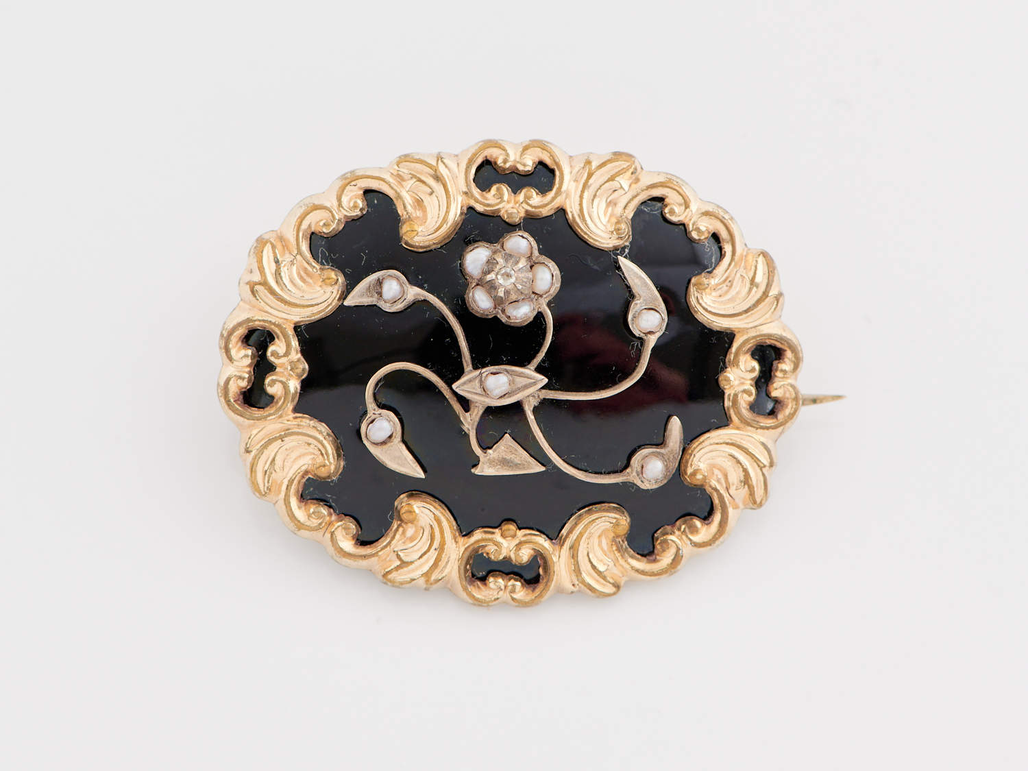 A VICTORIAN ENAMELLED MOURNING BROOCH IN GOLD PLATE, WITH SEED PEARL AND DIAMOND DETAIL, 40 X 30MM