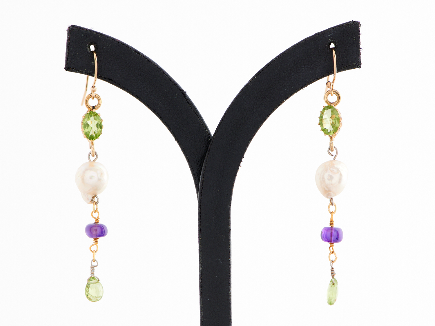 A PAIR BAROQUE PEARL PERIDOT AND AMETHYST DROP EARRINGS TO 14CT GOLD FILLED SHEPHERDS HOOKS, DROP LENGTH 62MM