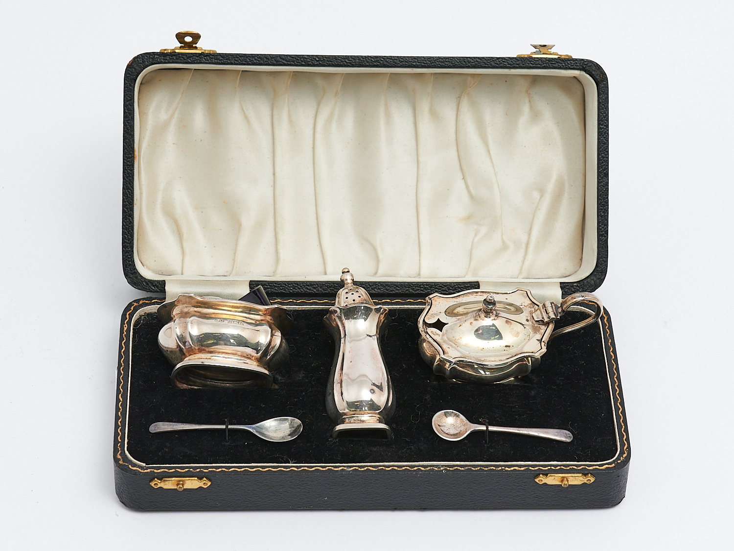 A STERLING SILVER CRUET SET, CASED LEONARD JOEL LOCAL DELIVERY: SMALL