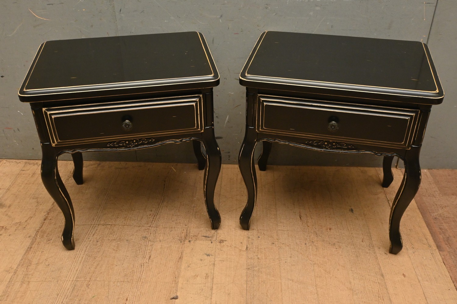 A PAIR OF EBONISED SINGLE DRAWER LOUIS XV STYLE BEDSIDE TABLES (60H X 55W X 42D CM) (LEONARD JOEL DELIVERY SIZE: LARGE)