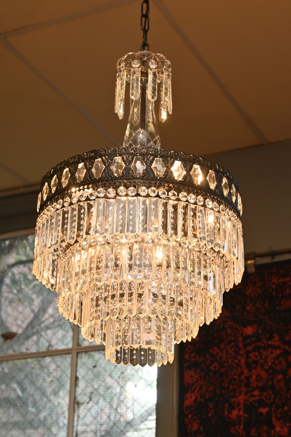 A FOUR TIERED SATIN BLACK FRAMED CRYSTAL DROPLET CHANDELIER (120H X 50D CM) (LEONARD JOEL DELIVERY SIZE: LARGE)