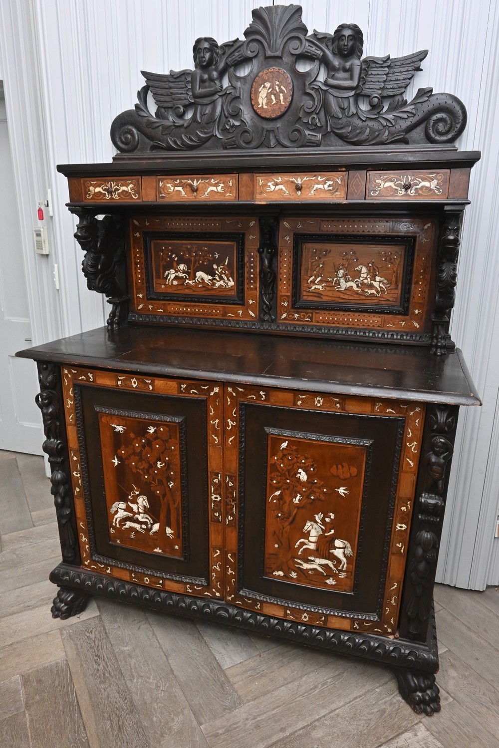 A 19th CENTURY 'RENAISSANCE REVIVAL' WALNUT AND EBONISED SIDEBOARD, RICHLY INLAID IN BONE AND VARIOUS WOODS (A/F) (220H X 144W X 60D CM) (PLEASE NOTE THIS HEAVY ITEM MUST BE REMOVED BY CARRIERS AT THE CUSTOMER'S EXPENSE. LEONARD JOEL STAFF CANNOT ASSIST CARRYING THIS ITEM) (X-LARGE ITEM)