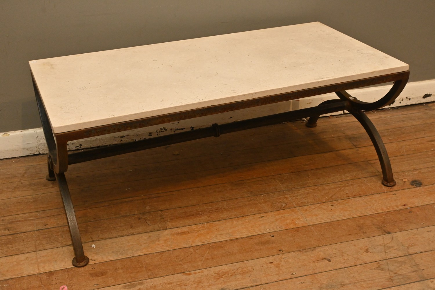 A TRAVERTINE TOPPED COFFEE TABLE (44H X 111W X 55D CM) (PLEASE NOTE THIS HEAVY ITEM MUST BE REMOVED BY CARRIERS AT THE CUSTOMER'S EXPENSE. LEONARD JOEL STAFF CANNOT ASSIST CARRYING THIS ITEM) (X-LARGE ITEM)