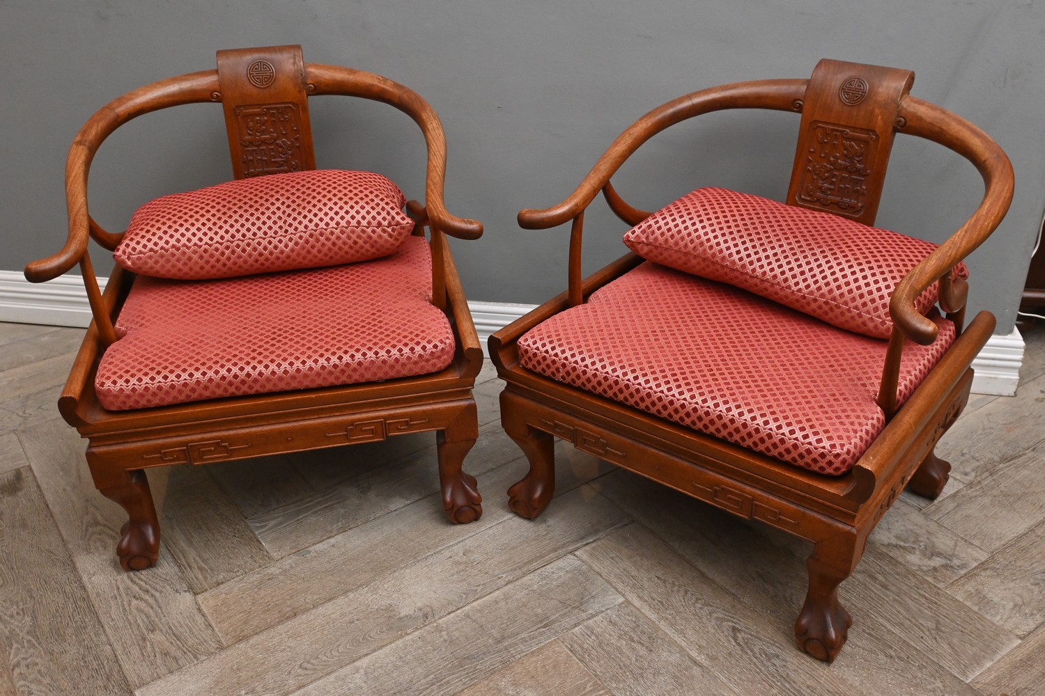 A PAIR OF CHINESE HARDWOOD LOW HORSESHOE-BACK ARMCHAIRS (A/F) (76H X 74W X 80D CM) (LEONARD JOEL DELIVERY SIZE: X-LARGE)