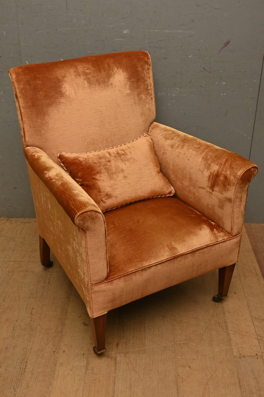AN UPHOLSTERED ARMCHAIR ON CASTORS WITH MATCHED CUSHIONS (A/F) (90H X 72W X 64D CM) (LEONARD JOEL DELIVERY SIZE: X-LARGE)