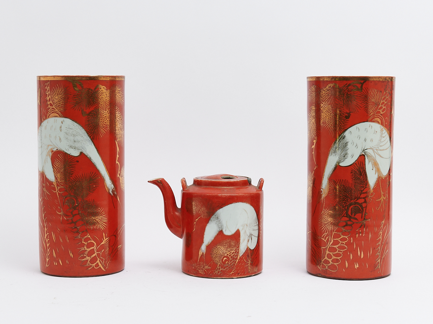 THREE PIECES OF RED GLAZED POTTERY, TWO VASES AND TEAPOT H.27.5CM (TALLEST), LEONARD JOEL LOCAL DELIVERY: MEDIUM