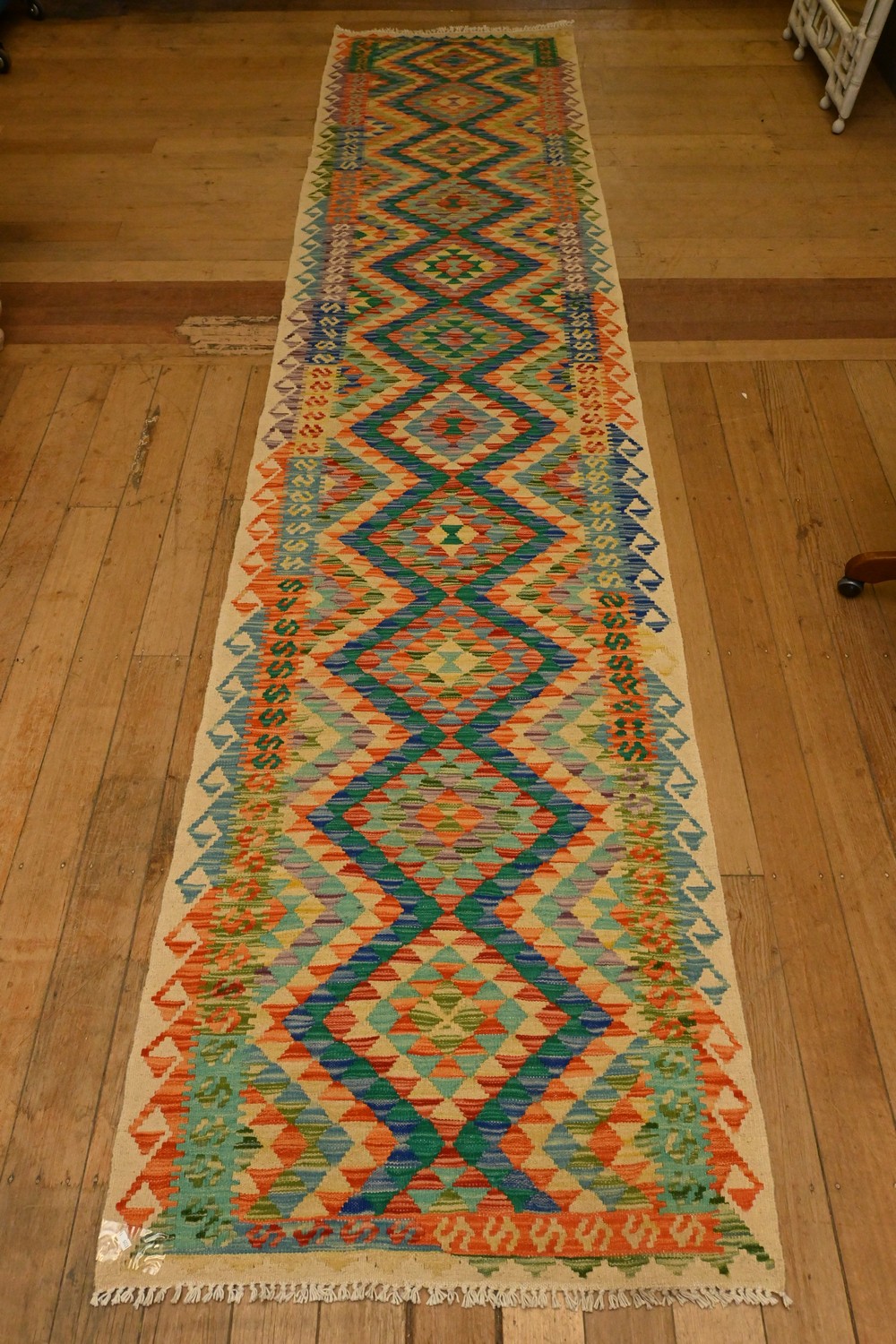 AN AFGHAN KAZAK KILIM RUNNER IN CAUCASIAN DESIGN, ALL VEGETABLE DYES, FULLY REVERSABLE, HAND WOVEN (408 X 86 CM)