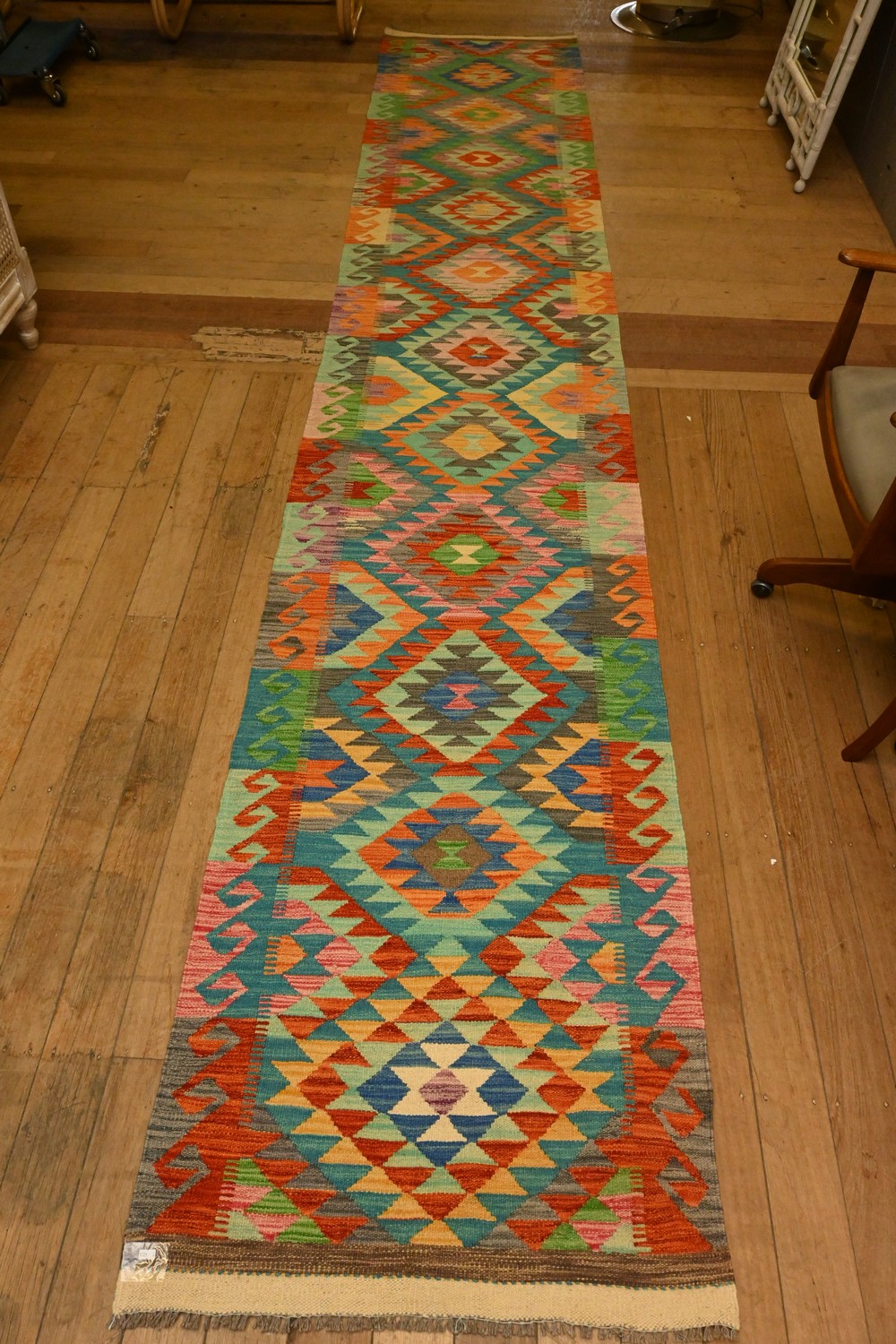 AN AFGHAN KAZAK KILIM RUNNER IN CAUCASIAN DESIGN, ALL VEGETABLE DYES, FULLY REVERSABLE, HAND WOVEN (490 X 82 CM)