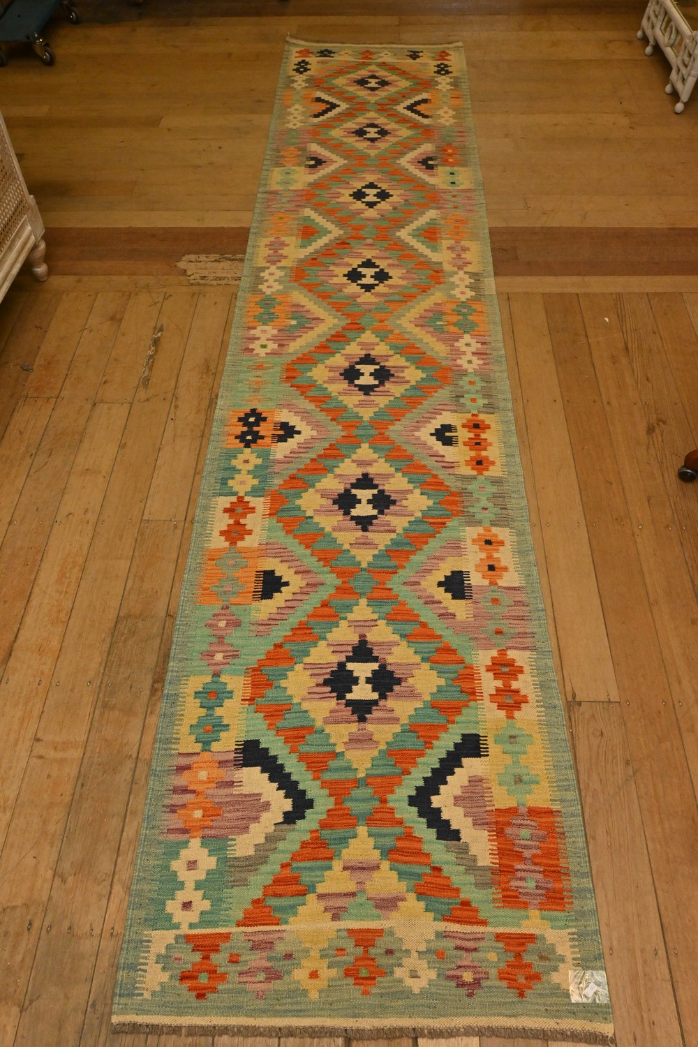 AN AFGHAN KAZAK KILIM RUNNER IN CAUCASIAN DESIGN, ALL VEGETABLE DYES, FULLY REVERSABLE, HAND WOVEN (394 X 82 CM)