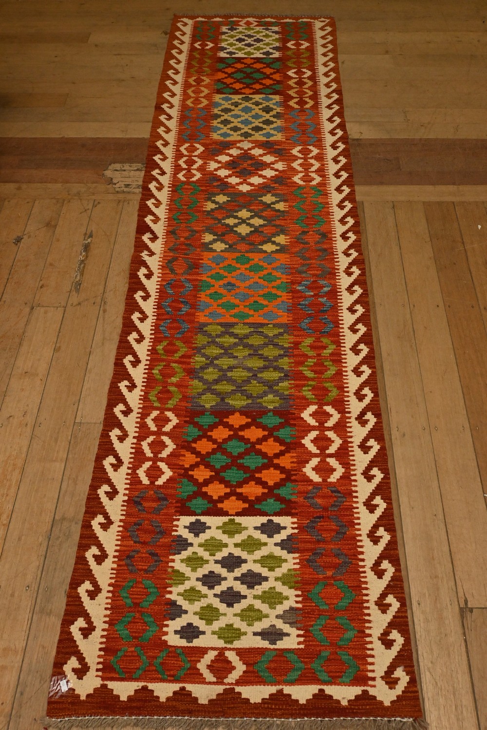 AN AFGHAN KAZAK KILIM RUNNER IN CAUCASIAN DESIGN, ALL VEGETABLE DYES, FULLY REVERSABLE, HAND WOVEN (305 X 77 CM)