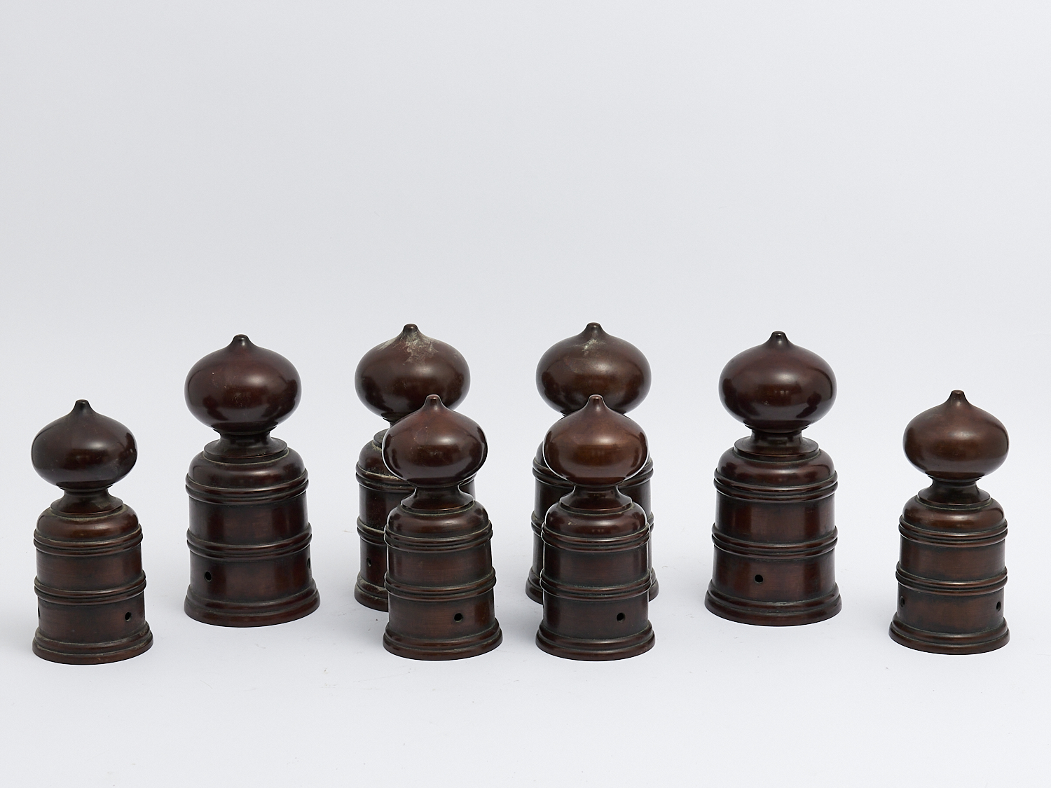 A SET OF EIGHT JAPANESE BRONZE 'GIBOSHI' BRIDGE POST FINIALS, MEIJI PERIOD H.21.5CM (TALLEST), LEONARD JOEL LOCAL DELIVERY: MEDIUM