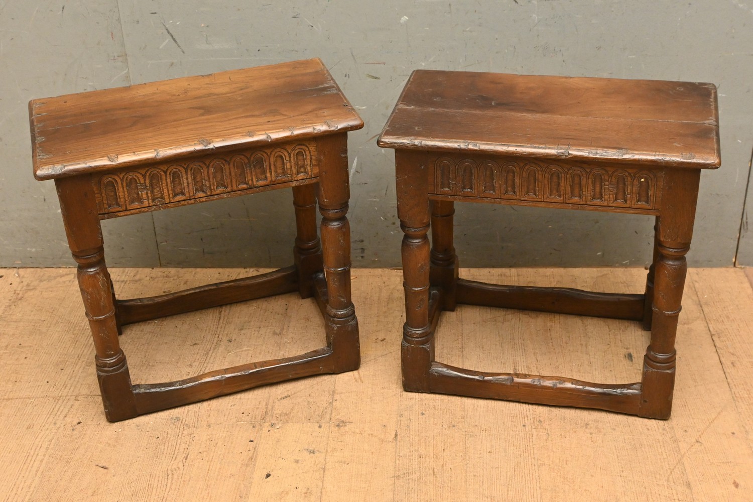 A PAIR OF 17TH CENTURY STYLE OAK JOINT STOOLS ( 47H X 49W X 28D CM) (LEONARD JOEL DELIVERY SIZE: LARGE)