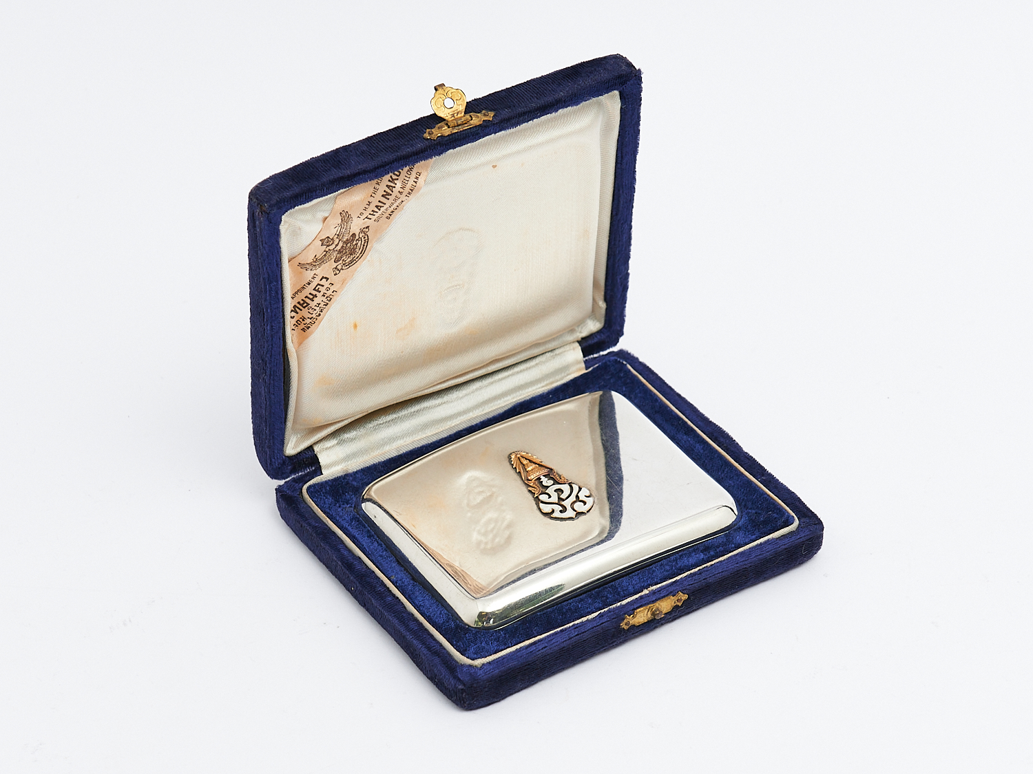 A SILVER CIGARETTE CASE PRESENTED BY KING OF THAILAND, BHUMIBOL ADULYADEJ, ROYAL CYPHER TO LID W.10CM, LEONARD JOEL LOCAL DELIVERY: SMALL