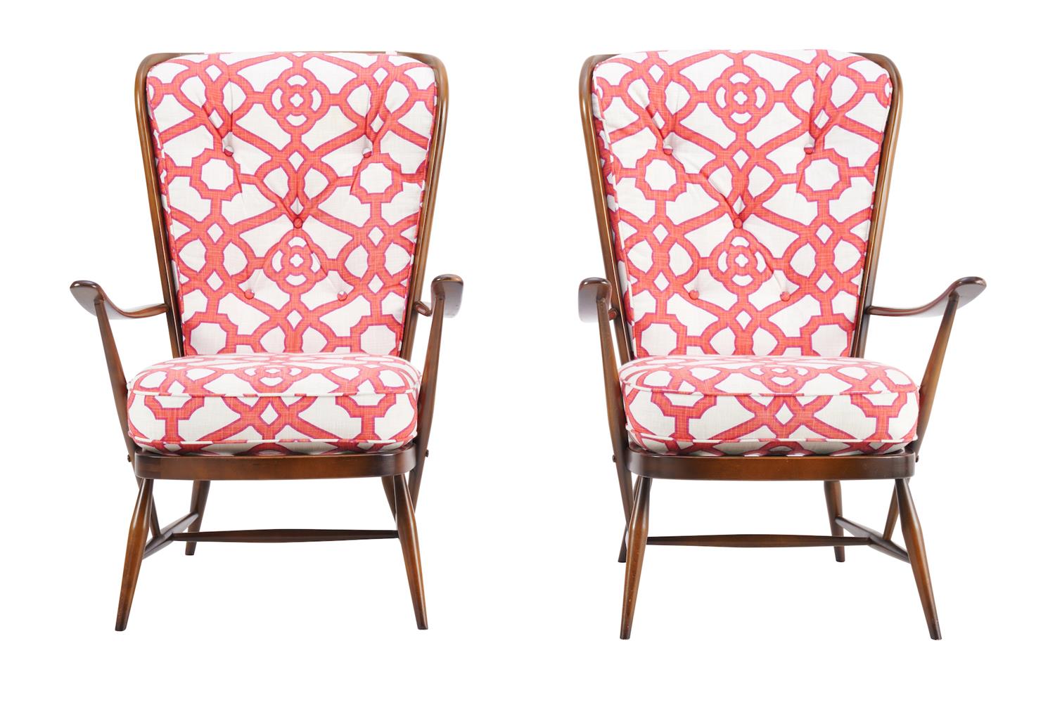 New cushions are very firm and fabric is in excellent condition. Press studs have been added to top back frames of both chairs to hold back cushions in place. Webbing to both chairs is in very good condition. Some scratches and marks to frame on both, particularly to arms. Signs of some repaired scratches and marks to both. Wear to stain on both chairs, particularly to one armrest.