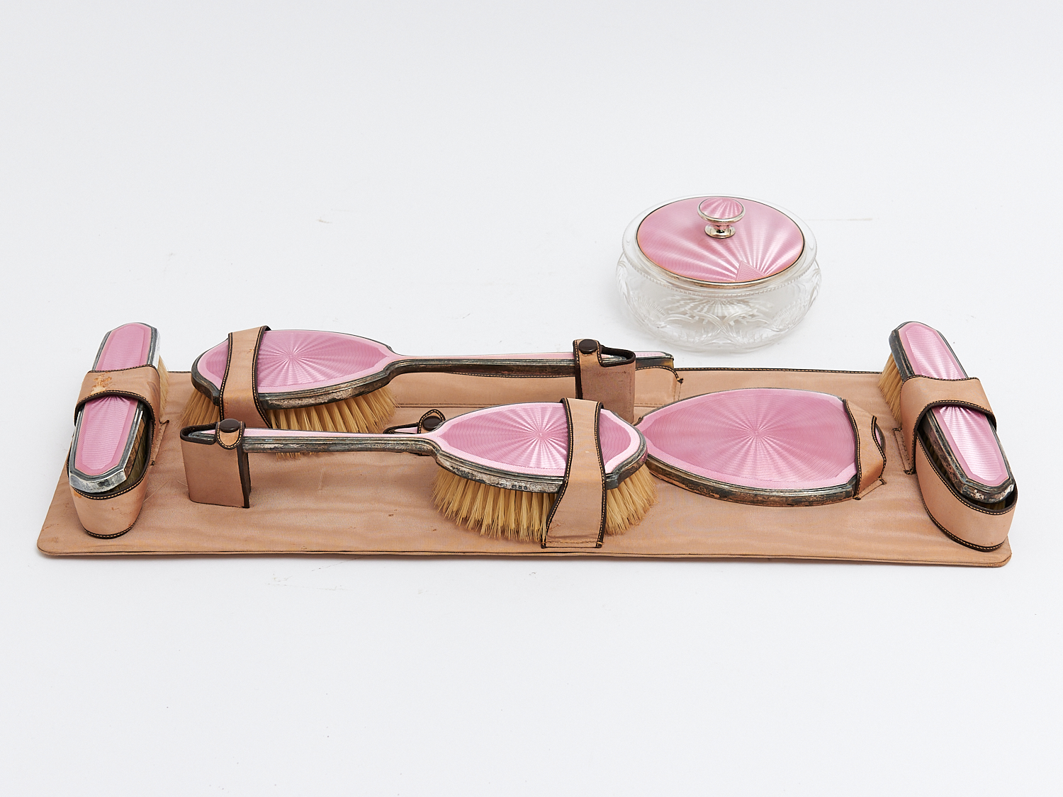 A MAPPIN AND WEBB DRESSING TABLE SET WITH PINK GUILLOCHE ENAMEL AND STERLING SILVER SILVER EDGES, W.53CM, LEONARD JOEL LOCAL DELIVERY: MEDIUM