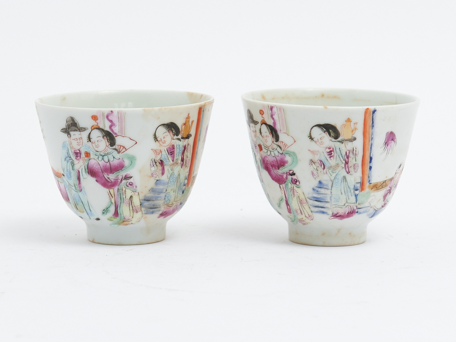 A PAIR OF FAMILLE ROSE CUPS WITH FIGURES, LATE QING (A/F) H.6CM, LEONARD JOEL LOCAL DELIVERY: SMALL