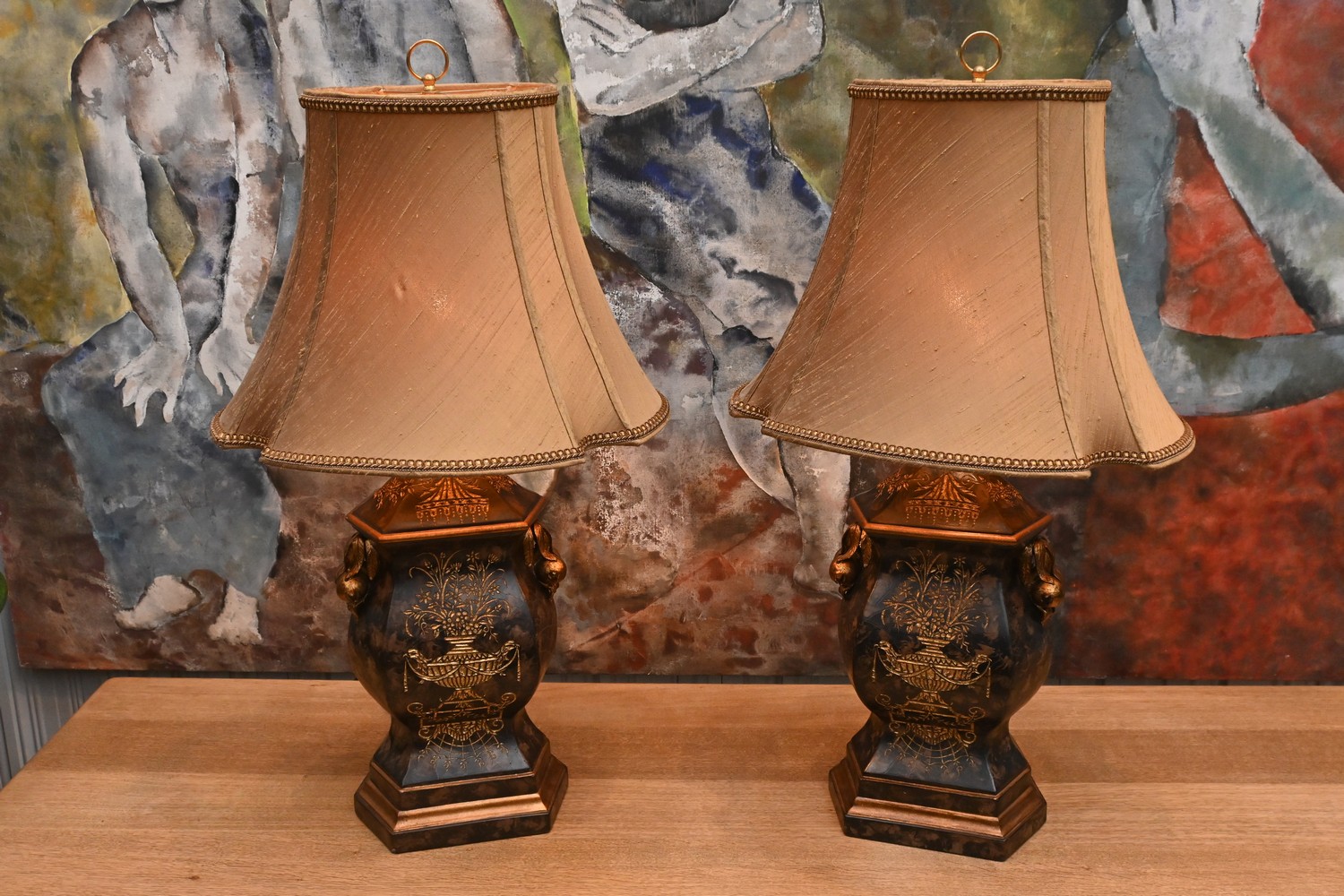 A PAIR OF CLASSICAL FRENCH STYLE TABLE LAMPS WITH GILT EFFECT DETAILING (86H X 60W X 50D CM) (LEONARD JOEL DELIVERY SIZE: LARGE)