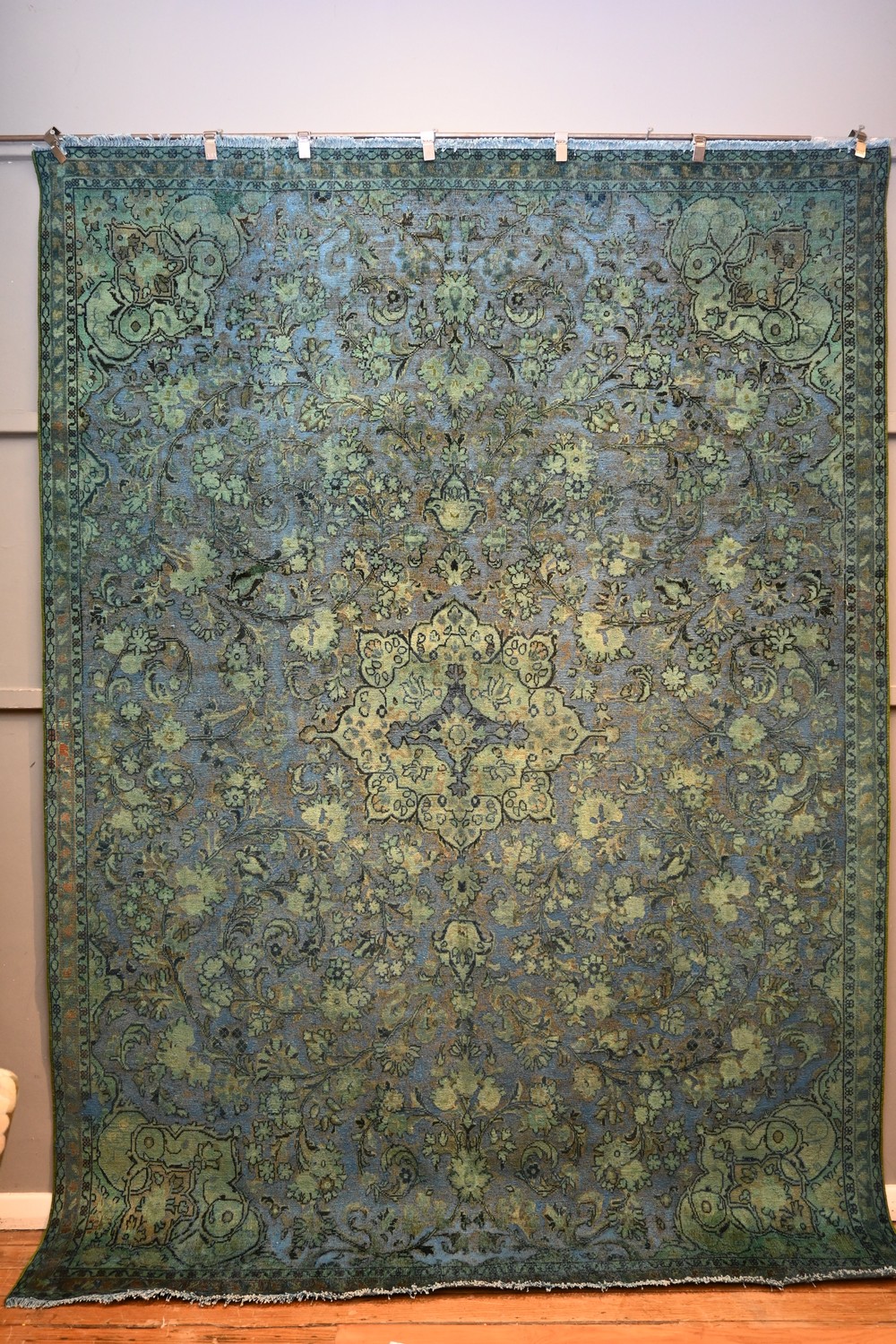 A FABULOUS VINTAGE OVER-DYED PERSIAN TABRIZ CARPET, VINTAGE PILE. AN AUTHENTIC VINTAGE ALL-OVER DESIGN TABRIZ CARPET WITH THE PILE SHORN AND OVER-DYED IN BLUES, GREEN AND BLACK TONES. SIZE: 342 X 248CM ORIGIN: PERSIA - RRP: $5,900