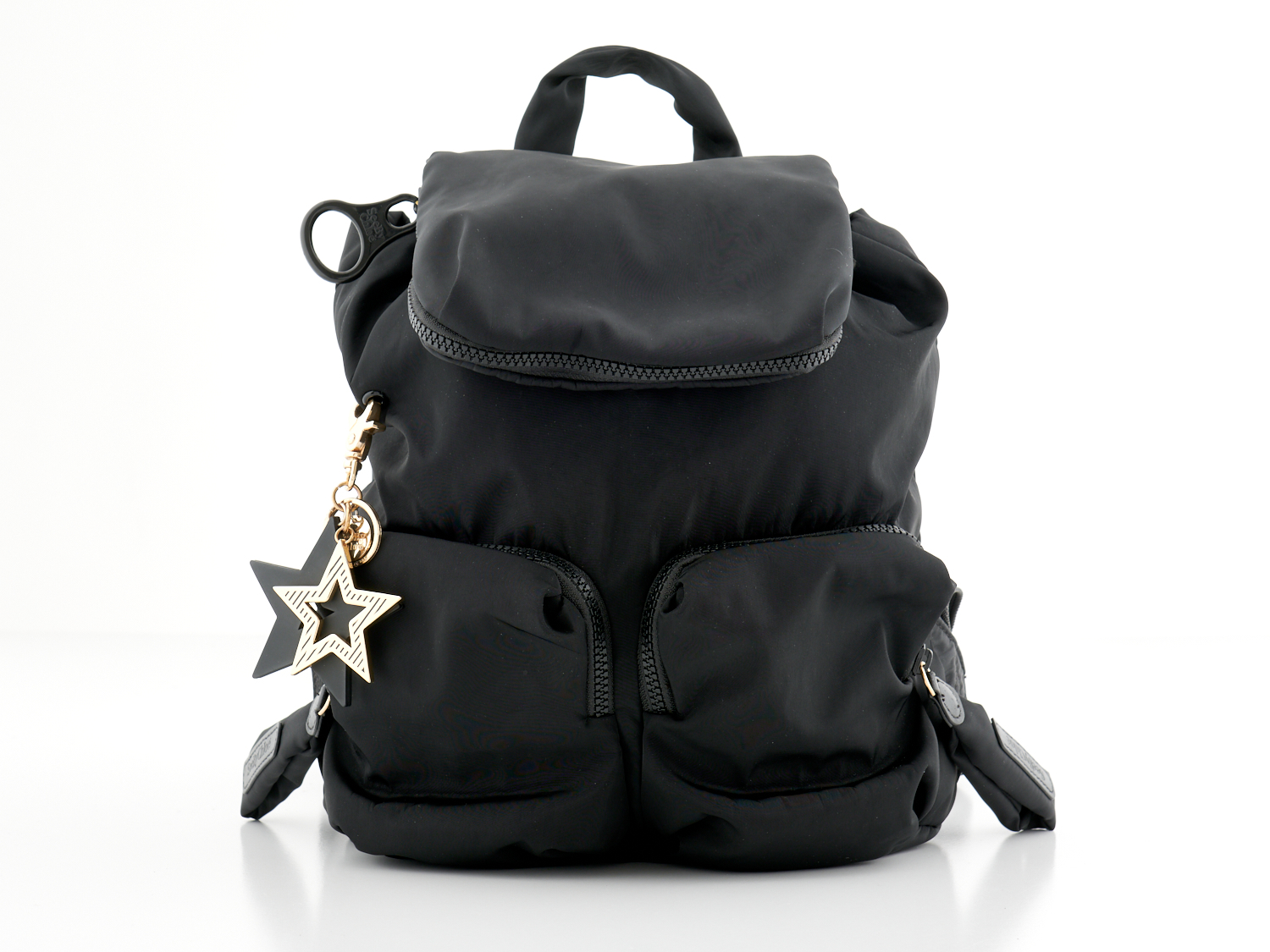 SEE BY CHLOE, BACKPACK JOY RIDER - Styled in black padded nylon to a rope drawstring with charms in gilt chrome and rubber, accompanied by original dustbag, 25 x 30cm.