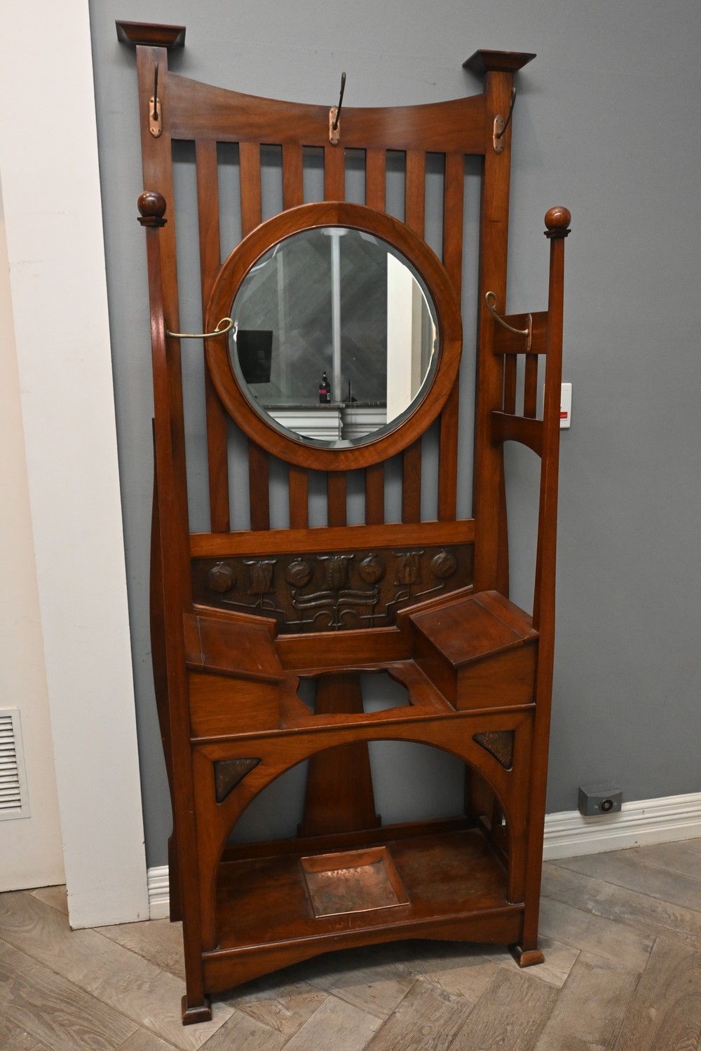AN EARLY 20TH CENTURY MIRROR BACKED HALL STAND (A/F) (212H X 92W X 37D CM) (LEONARD JOEL DELIVERY SIZE: X-LARGE)