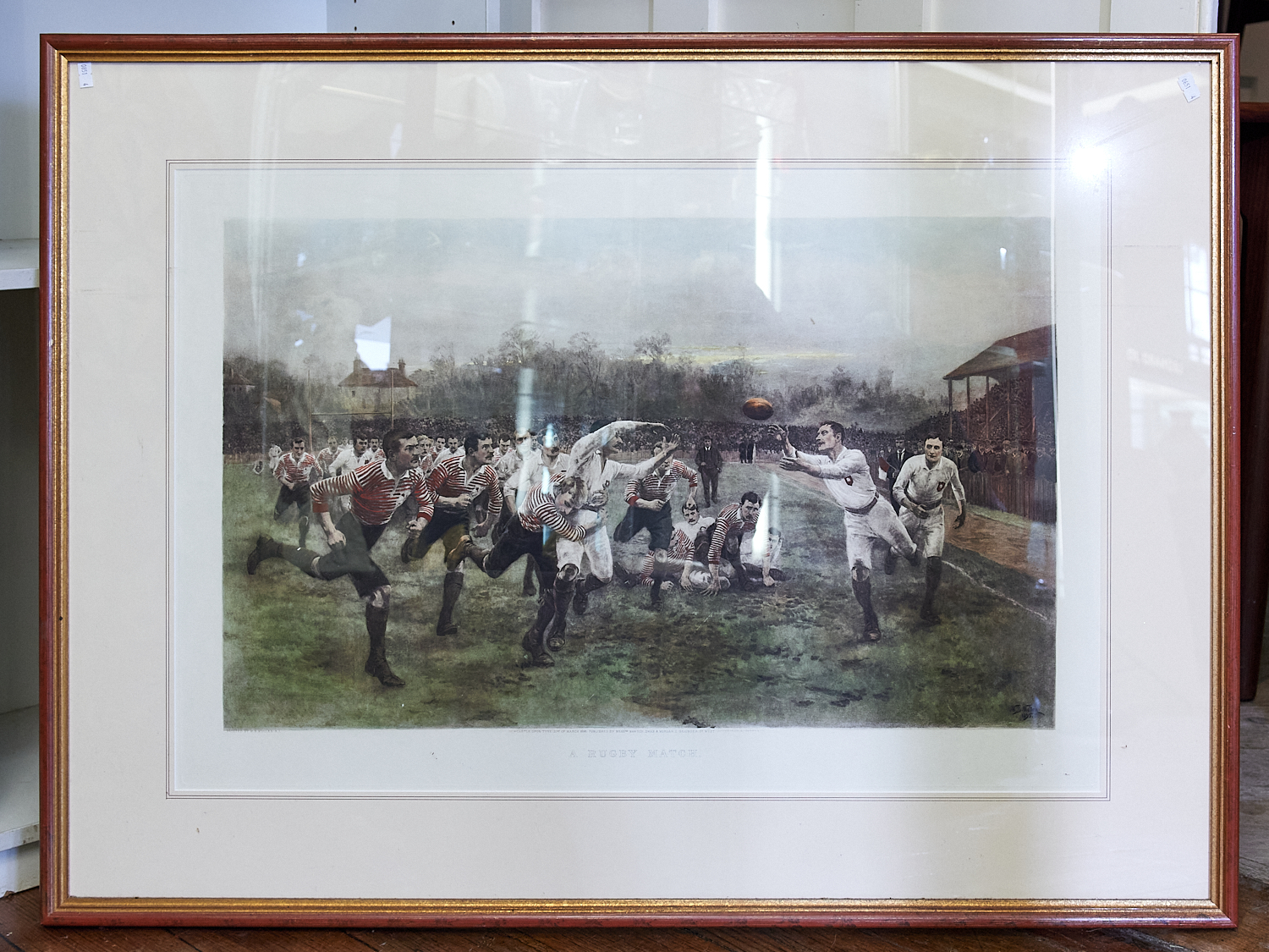 A FRAMED RESTRIKE OF 1896 RUGBY MATCH LITHOGRAPH H.81CM X W.106CM, LEONARD JOEL LOCAL DELIVERY: MEDIUM