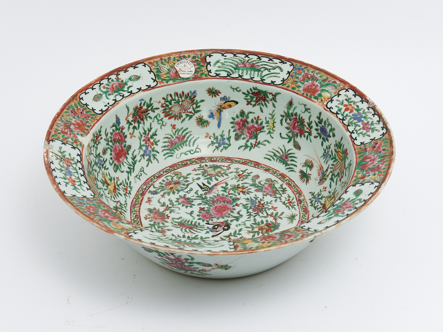 A CHINESE PORCELAIN FAMILLE ROSE BOWL WITH FLORA AND INSECT DESIGN. EX CHRISTIES ERIC DARE COLLECTION (A/F REPAIR) DIA.37CM, LEONARD JOEL LOCAL DELIVERY: MEDIUM