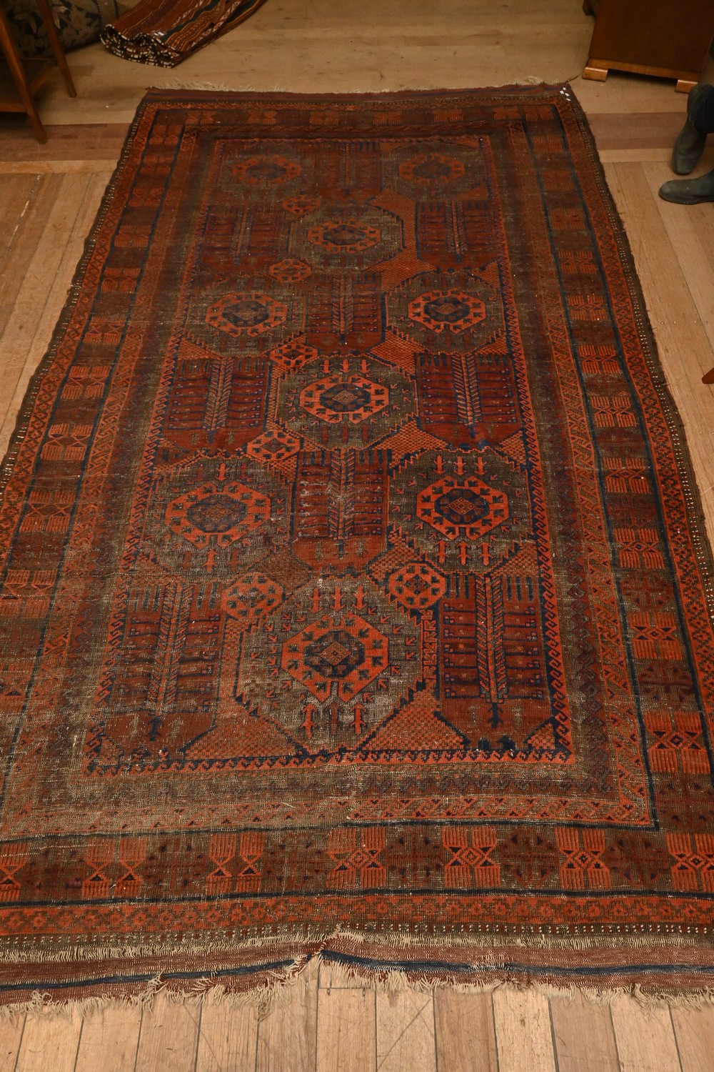 A HANDMADE FLATWEAVE RUG WITH GEOMETRIC DESIGN IN RED TONES (A/F) (342 X 194 CM) (LEONARD JOEL DELIVERY SIZE: X-LARGE)