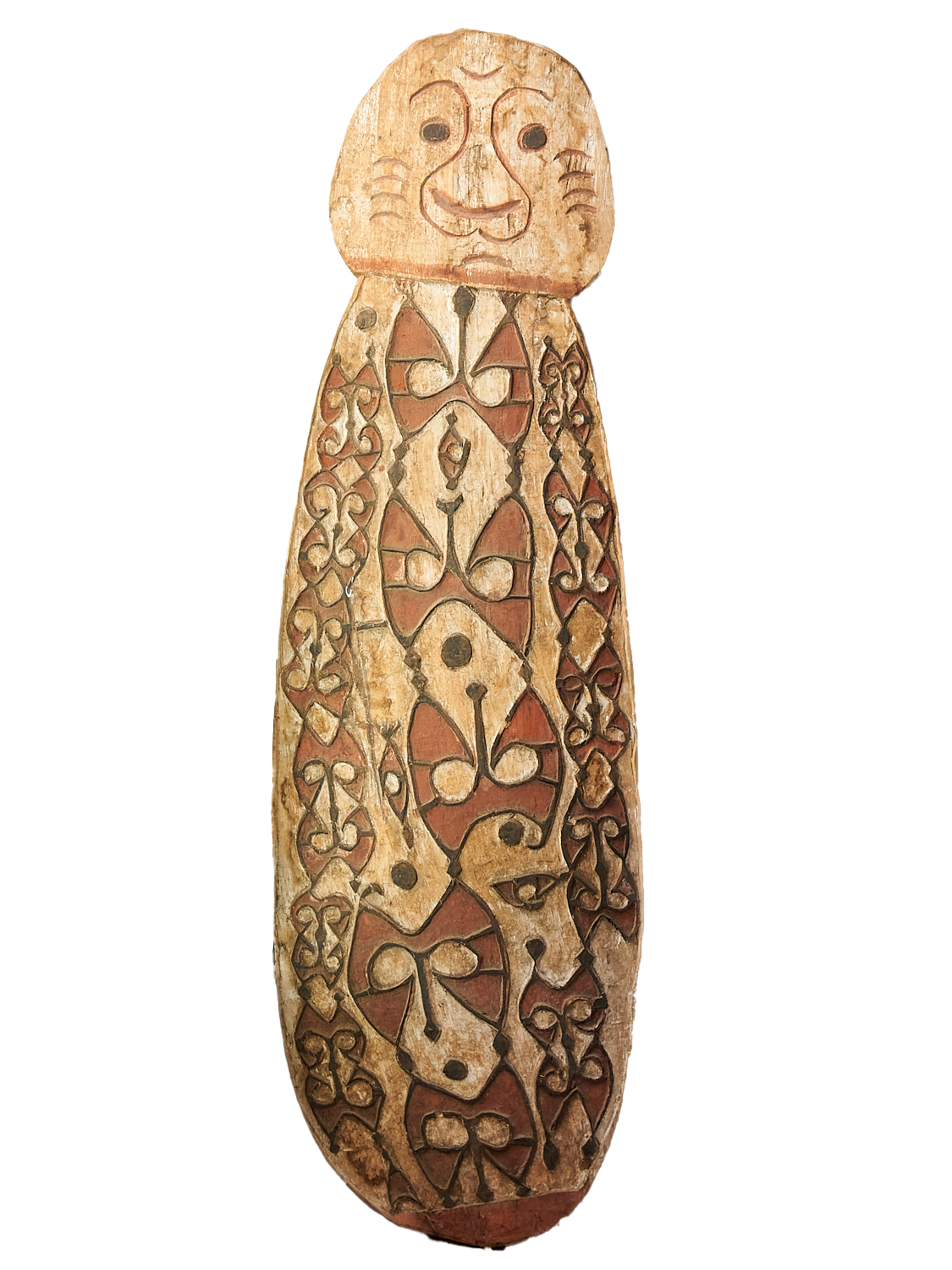 A PAPUA NEW GUINEA CARVED TIMBER SHIELD H.172CM, LEONARD JOEL LOCAL DELIVERY: MEDIUM