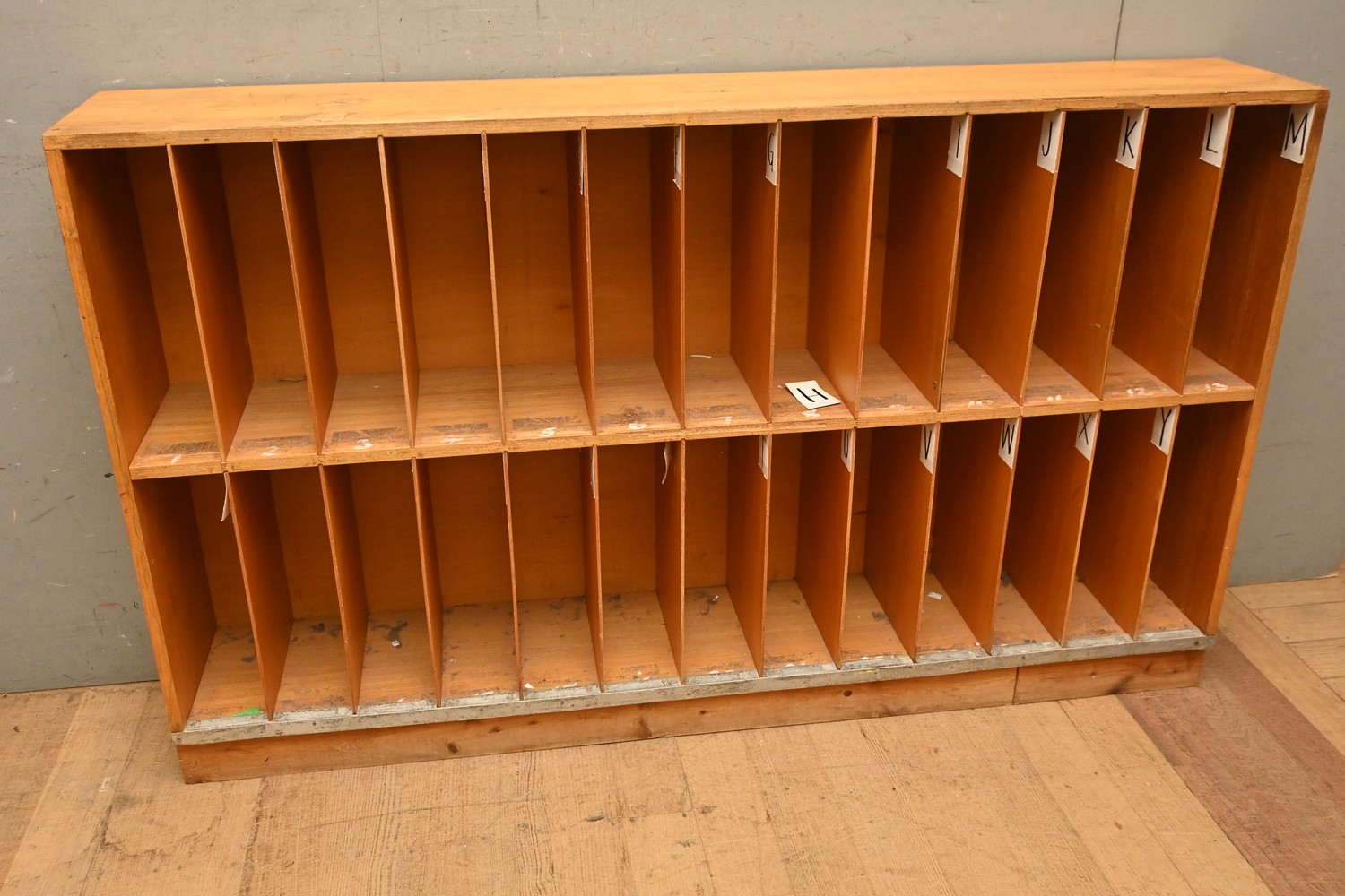 A 26 HOLE RECORD CABINET IN ASH (A/F) (99H X 165W X 28D CM) (PLEASE NOTE THIS HEAVY ITEM MUST BE REMOVED BY CARRIERS AT THE CUSTOMER'S EXPENSE. LEONARD JOEL STAFF CANNOT ASSIST CARRYING THIS ITEM) (X-LARGE ITEM)