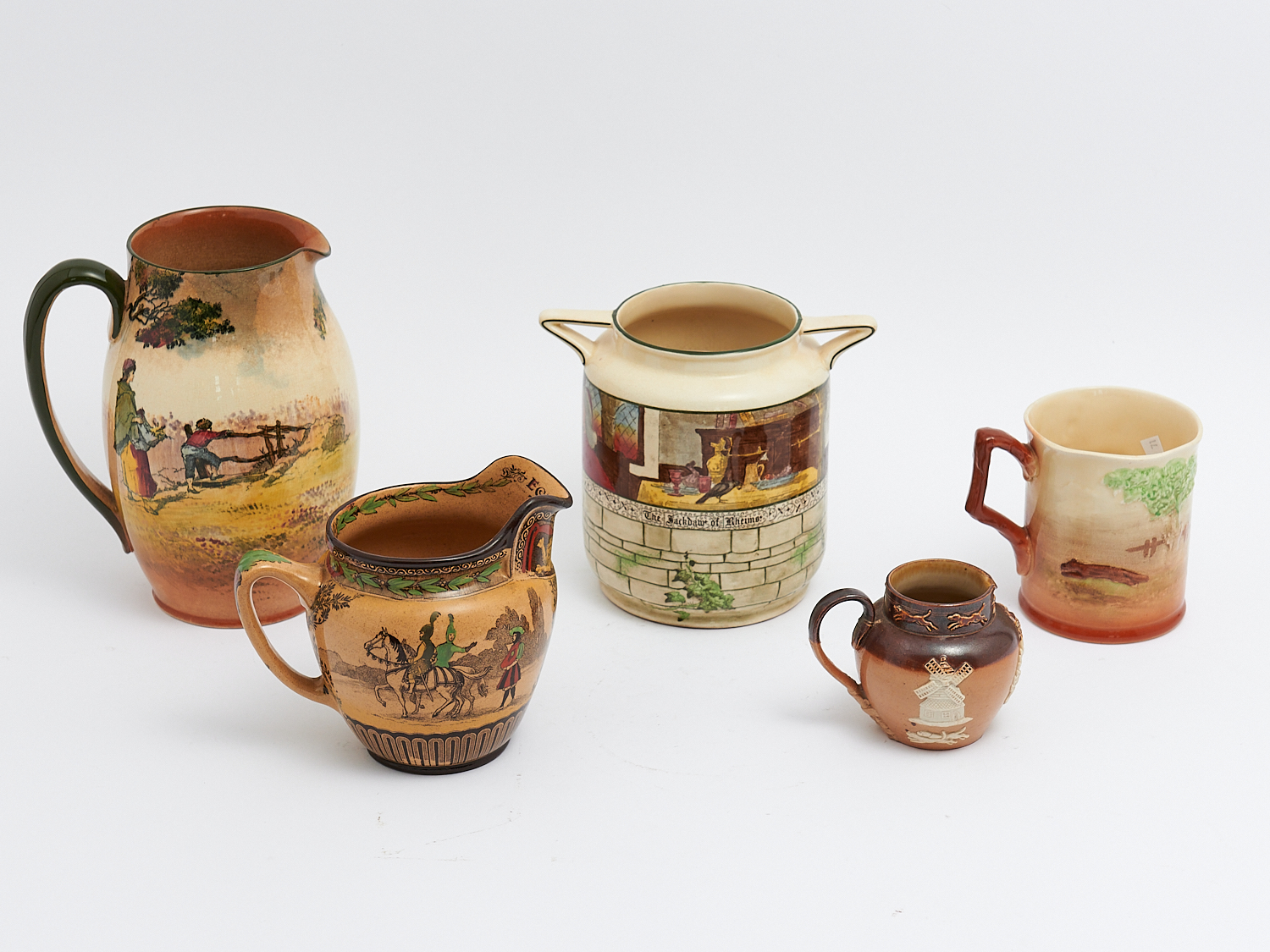 A GROUP OF DOULTON JUGS AND VASES INCLUDING THE GLEANERS H.20.5CM (TALLEST), LEONARD JOEL LOCAL DELIVERY: MEDIUM