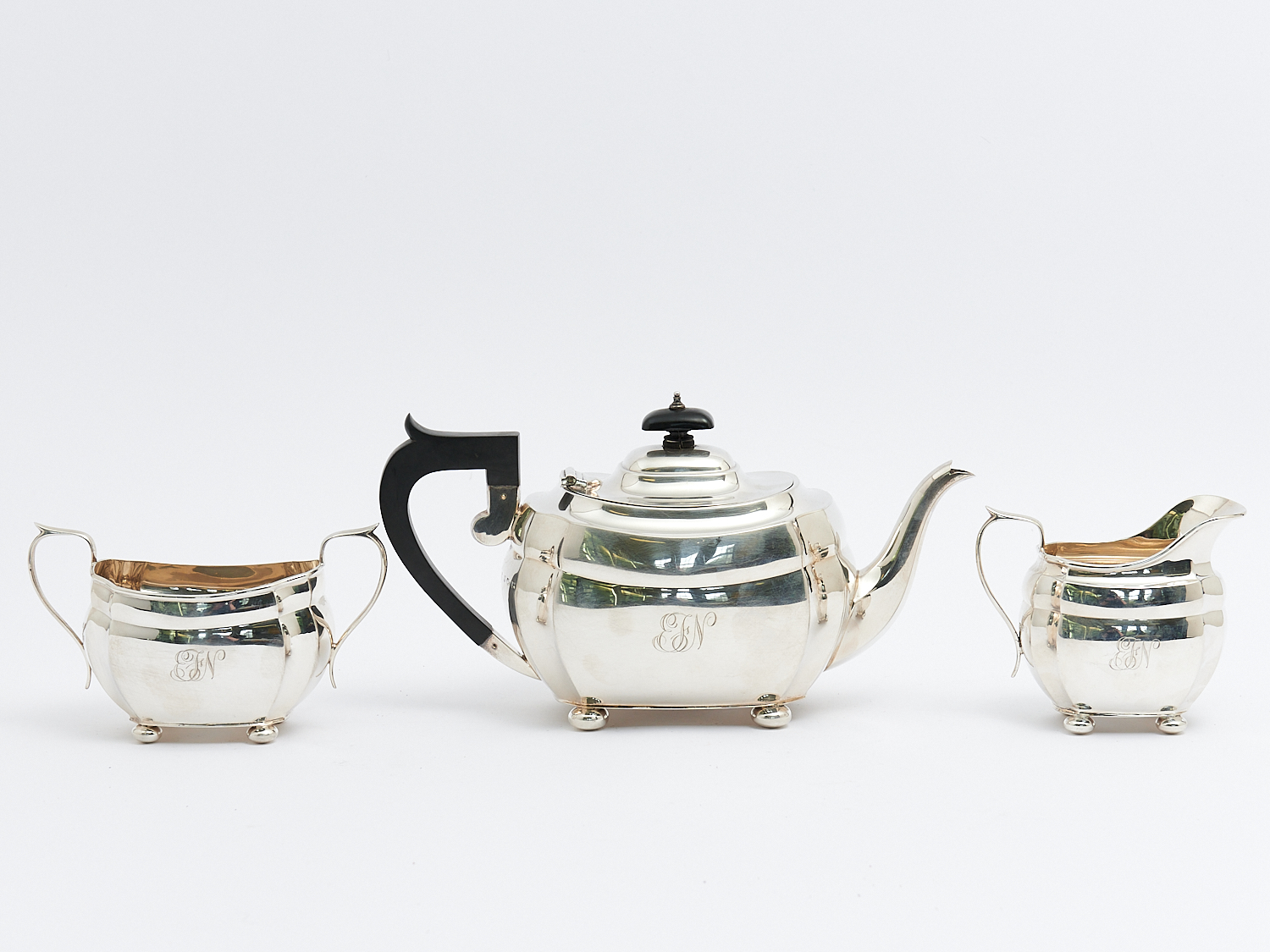 A THREE-PIECE ENGLISH HALLMARKED STERLING SILVER ART DECO TEA SET - 814 GRAMS, LEONARD JOEL LOCAL DELIVERY: SMALL