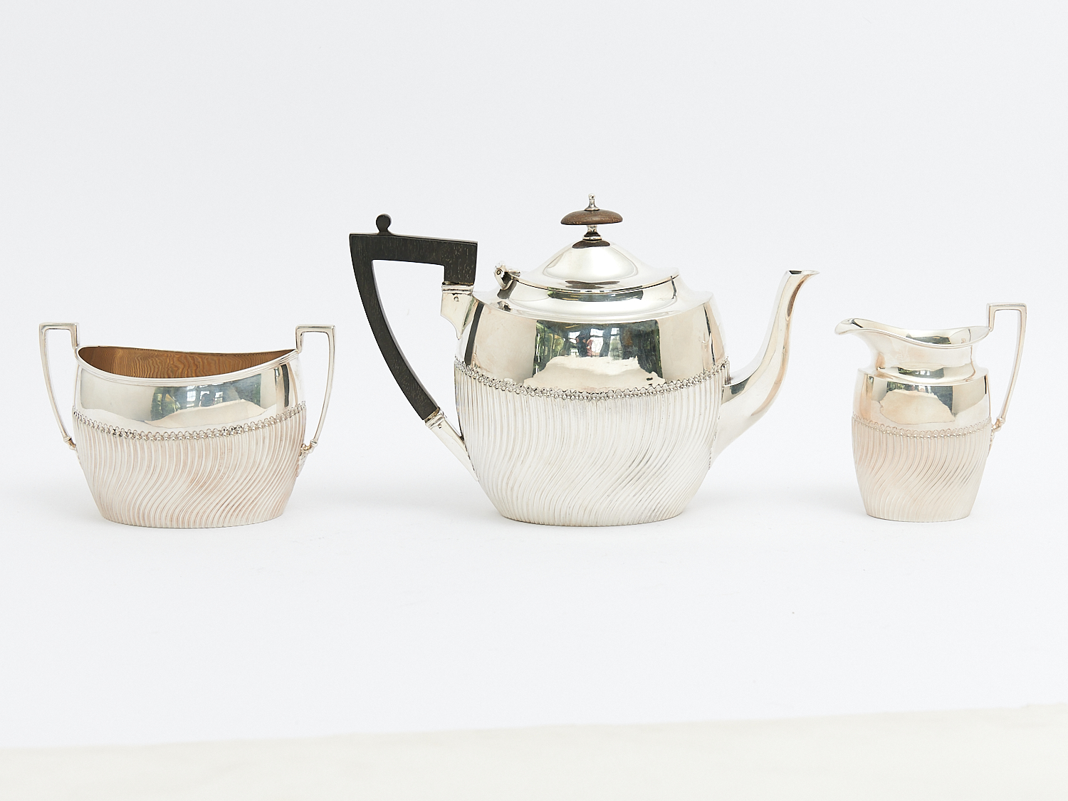 A THREE-PIECE STERLING SILVER PARTIALLY FLUTED TEA SET - 760 GRAMS, LEONARD JOEL LOCAL DELIVERY: SMALL